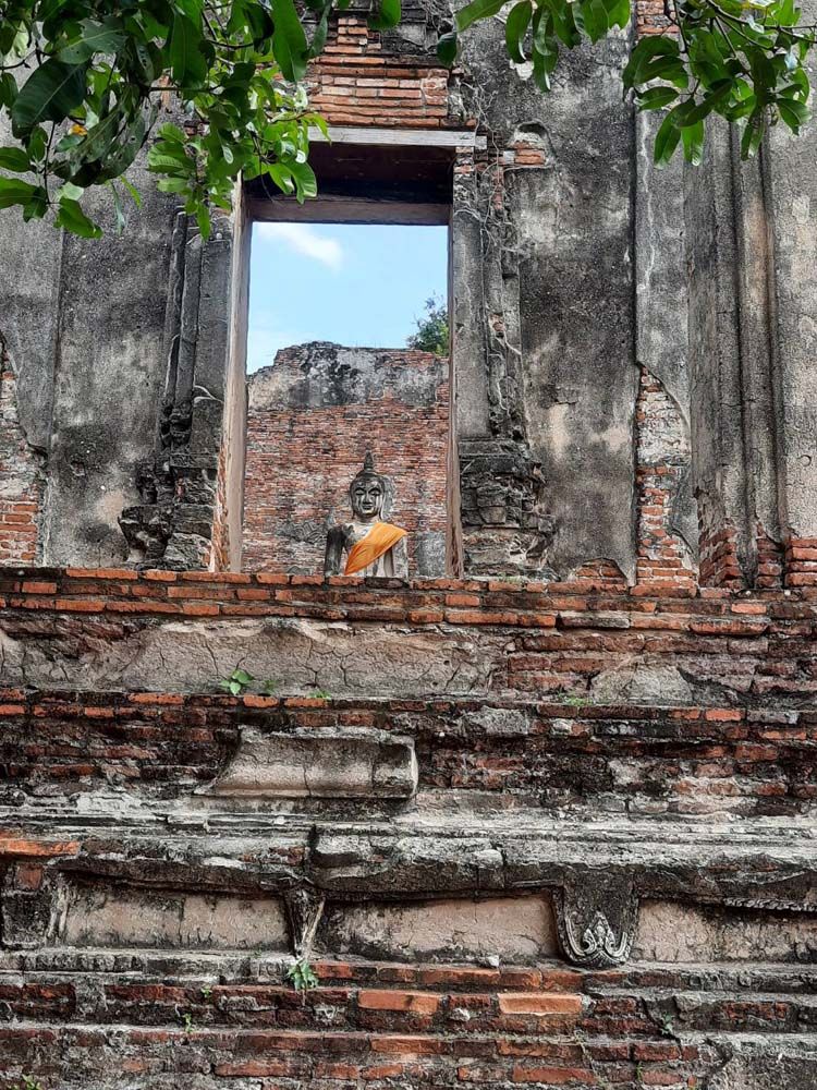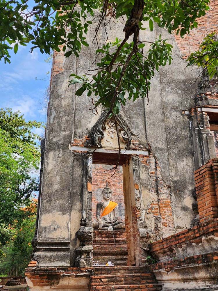 ส่วนอีกวัดเก่าที่พาไปชมอีกวัดหนึ่งคือวัดบรมพุทธาราม ปัจจุบันอยู่ในเขตรั้วของมหาวิทยาลัยราชภัฏพระนครศรีอยุธยา แม้วัดนี้เกือบจะเหลือเพียงซากของวัด แต่ก็ยังมีความงดงามหลงเหลือให้ชมอย่างน่าอัศจรรย์ใจ โดยเฉพาะลวดลายปูนปั้นที่งดงามมากที่ยังหลงเหลืออยู่ที่เหนือกรอบประตูอุโบสถ