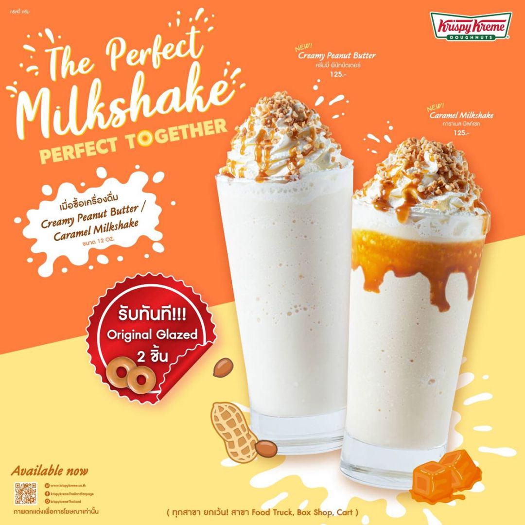 นอกจากนี้ คริสปี้ ครีม ประเทศไทย ครีเอทเครื่องดื่มใหม่ล่าสุด THE PERFECT MILKSHAKE เอาใจมิลค์เชคเลิฟเวอร์ กับ “คาราเมล มิลค์เชค” (Caramel Milkshake) เครื่องดื่มนมปั่นสูตรพรีเมียมที่มาพร้อมคาราเมลหอมหวาน ท็อปวิปครีมเนื้อเนียนด้านบน เพิ่มความฟินด้วยพีนัทกรุบกรอบ หรือ “ครีมมี่พีนัทบัตเตอร์” (Creamy Peanut Butter) จับคู่พีนัทบัตเตอร์หอมมันกับมิลค์เชคมาปั่นจนละเอียดเป็นเนื้อเดียว พร้อมวิปครีมนุ่มละมุนราดซอสคาราเมลฉ่ำ เติมความสุขด้วย “THE PERFECT MILKSHAKE PERFECT TOGETHER” ในราคาแก้วละ 125 บาท (ขนาด 12 ออนซ์) พร้อมรับสิทธิ์สุดพิเศษ!! เมื่อซื้อเครื่องดื่ม KRISPY KREME THE PERFECT MILKSHAKE PERFECT TOGETHER เมนูใดก็ได้ 1 แก้ว รับโดนัท คริสปี้ ครีม ออริจินัลเกลซ 2 ชิ้น ตั้งแต่วันนี้-10 กันยายน 2566 ที่ร้านคริสปี้ ครีม ทุกสาขาใกล้บ้านคุณ (เฉพาะสาขาที่ร่วมรายการ ยกเว้นคาร์ท, ฟู้ดทรัค และบ๊อกซ์ช้อป) ติดตามความเคลื่อนไหวของคริสปี้ ครีม โดนัทสุดโปรดของคุณได้ที่ www.krispykreme.co.th หรือ www.facebook.com/krispykremethailandfanpage หรือ #Krispykremethailand
