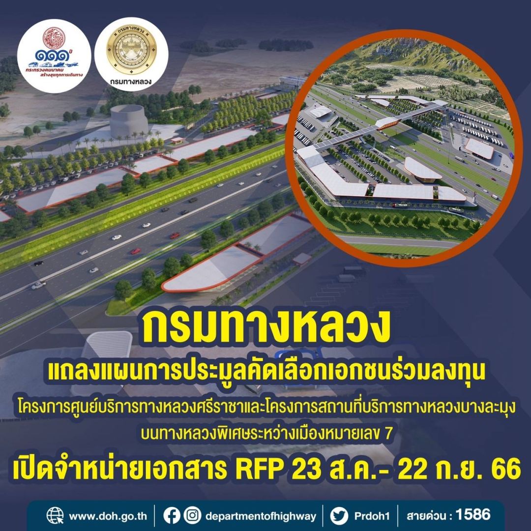 กรมทางหลวง จัดงานแถลงแผนการประมูลคัดเลือกเอกชนร่วมลงทุนในการพัฒนาและบริหารจัดการโครงการศูนย์บริการทางหลวงศรีราชาและโครงการสถานที่บริการทางหลวงบางละมุง บนทางหลวงพิเศษระหว่างเมืองหมายเลข 7 สายกรุงเทพมหานคร – บ้านฉาง ภายหลังออกประกาศเชิญชวนเอกชนเข้าร่วมการประมูลคัดเลือกไปเมื่อวันที่ 16 สิงหาคม 2566 ที่ผ่านมา เพื่อเผยแพร่ข้อมูลและแผนการประมูลโครงการที่พักริมทาง โดยเปิดโอกาสให้เอกชนที่มีศักยภาพและประสบการณ์มีส่วนร่วมในการลงทุนพัฒนาโครงสร้างพื้นฐานของภาครัฐ ตามพระราชบัญญัติการร่วมลงทุนระหว่างรัฐและเอกชน พ.ศ. 2562 เพื่อยกระดับการให้บริการของระบบทางหลวงพิเศษระหว่างเมืองสู่มาตรฐานสากล