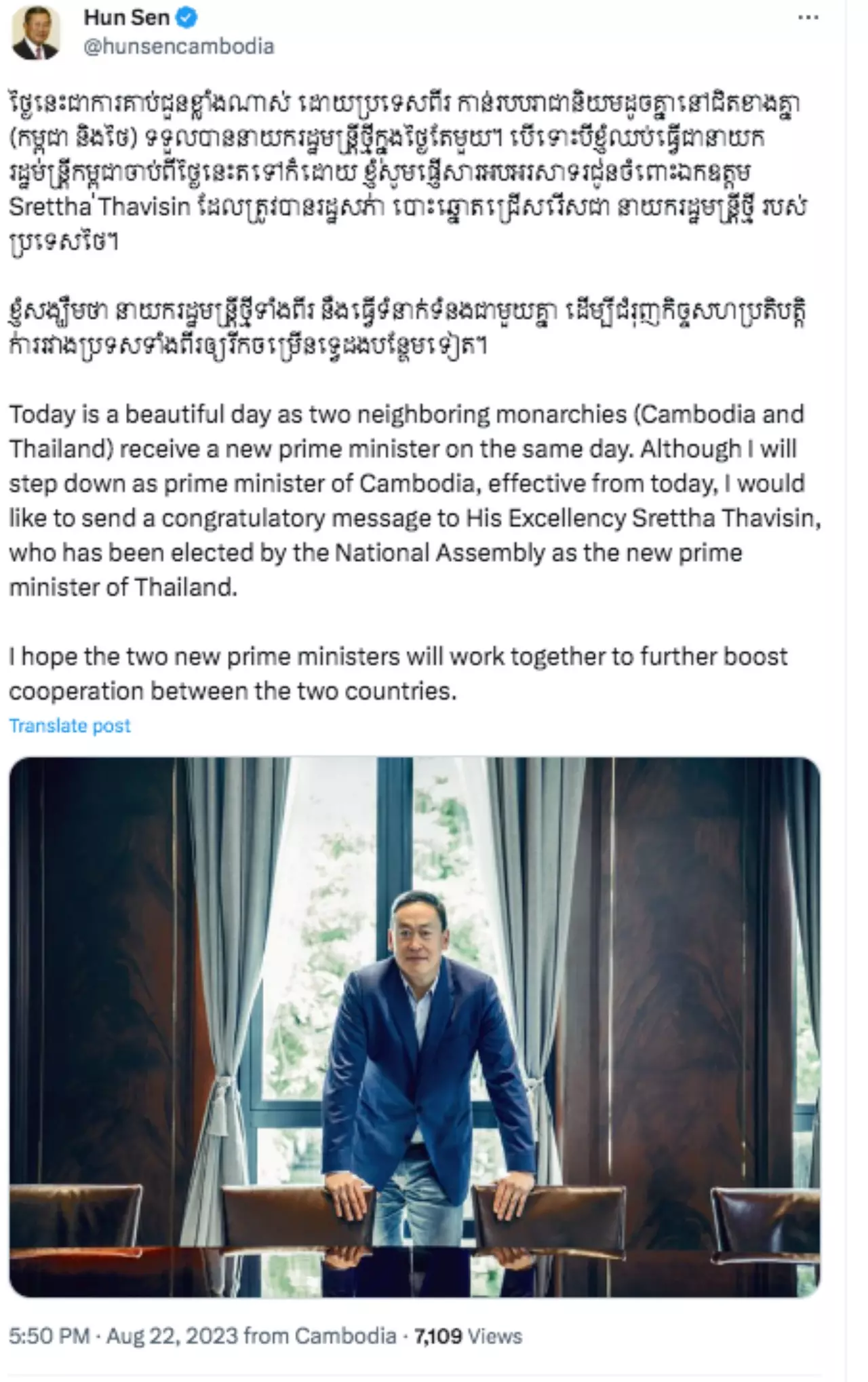 นายกรัฐมนตรีฮุน เซน แห่งกัมพูชา โพสต์ข้อความทางแพลตฟอร์มโซเชียลมีเดีย ‘X’(เอ็กซ์) หรือเดิมคือทวิตเตอร์ แสดงความยินดีกับนายเศรษฐา ทวีสิน ที่ได้รับการโหวตจากสมาชิกรัฐสภา ให้เป็นนายกรัฐมนตรีคนใหม่ของไทย เมื่อวันที่ 22 ส.ค. ที่ผ่านมา