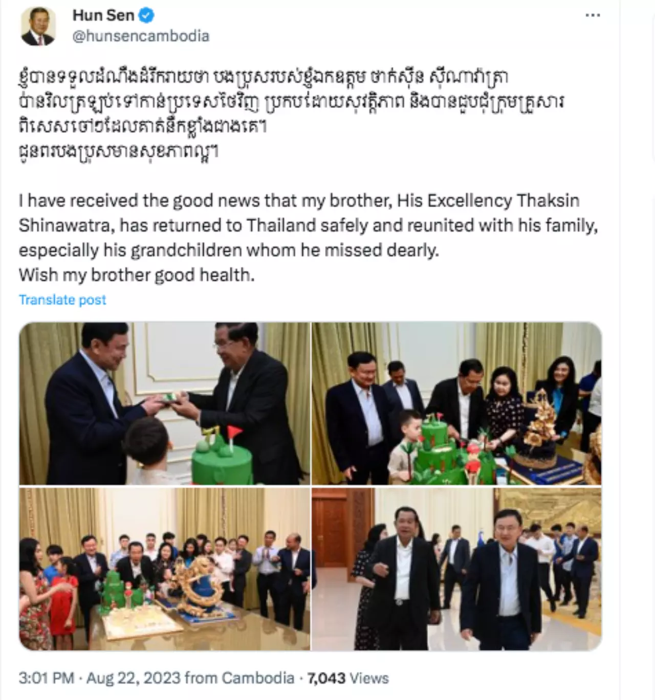 นอกจากนั้น สมเด็จฮุน เซน ได้โพสต์รูปถ่ายในวันที่นายทักษิณ ชินวัตร และยิ่งลักษณ์ ชินวัตร อดีตนายกรัฐมนตรีของไทยเดินทางมาร่วมอวยพรวันเกิดของตนด้วยบรรยากาศชื่นมื่นที่กรุงพนมเปญ เมื่อ 5 สิงหาคม ที่ผ่านมา