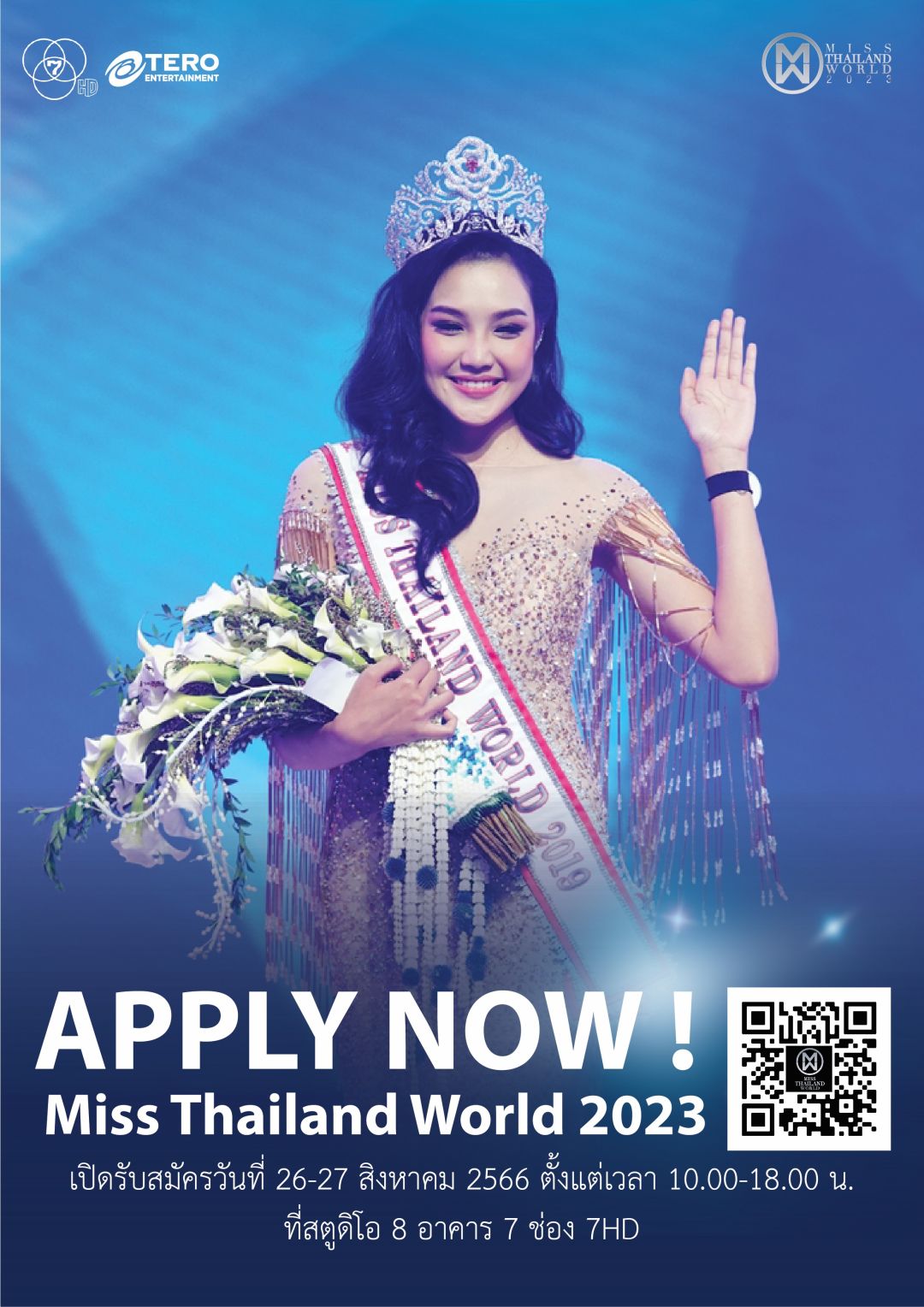 โดยทางกองประกวดมิสไทยแลนด์เวิลด์ 2023 จะเปิดรับสมัครสาวงามอายุระหว่าง 16 – 27 ปี ส่วนสูงตั้งแต่ 165 เซนติเมตรขึ้นไป สัญชาติไทย บุคลิกภาพดี มีความสวยงาม ฉลาด พร้อมแพชชั่นและความฝัน อันยิ่งใหญ่มาสมัครด้วยตัวเอง ในวันเสาร์ที่ 26 และวันอาทิตย์ที่ 27 สิงหาคม 2566 ณ สตูดิโอ 8 อาคาร 7 ช่อง 7HD ตั้งแต่เวลา 10.00 – 18.00 น. ทั้งนี้มิสไทยแลนด์เวิลด์ 2019 “เกรซ-นรินทร ชฎาภัทรวรโชติ” ซึ่งเป็นส่วนหนึ่งในคณะกรรมการในปีนี้ ขอเชิญชวนสาวงามรุ่นน้องดังนี้