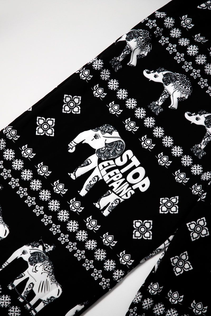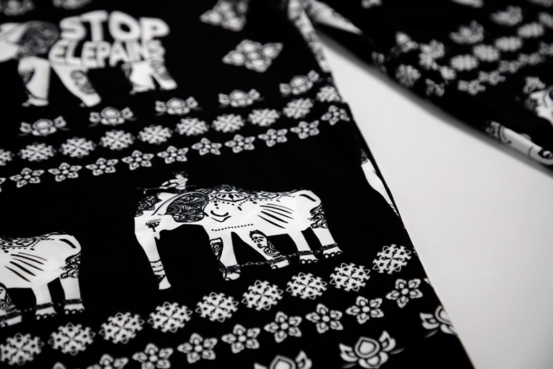 เรื่องราวเบื้องหลังการโชว์ช้างแสนรู้เหล่านี้ จึงปรากฏเป็นลวดลายบนกางเกงช้าง “Stop Elepains” แสดงภาพช้างที่ถูกฝึกให้ยืนบนเก้าอี้
