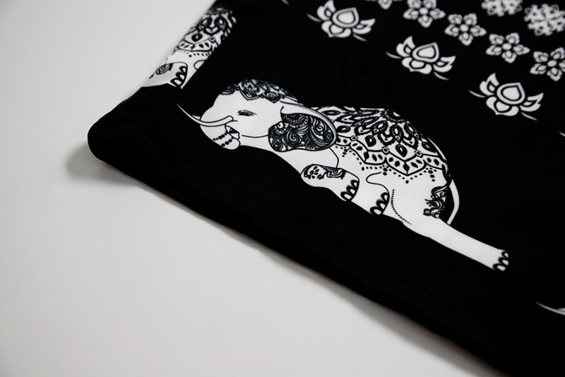 ตัวเล็กๆ ช้างที่มีรอยแผลตามตัว ช้างนอนหมดแรง และช้างที่มีน้ำตา ซึ่งเป็นลายพิมพ์ที่มีเอกลักษณ์ต่างจากกางเกงช้างตามท้องตลาดทั่วไป