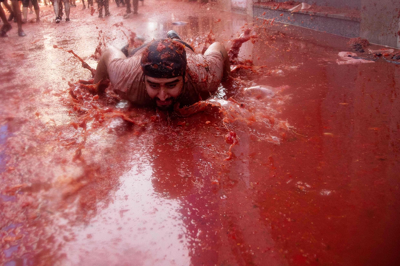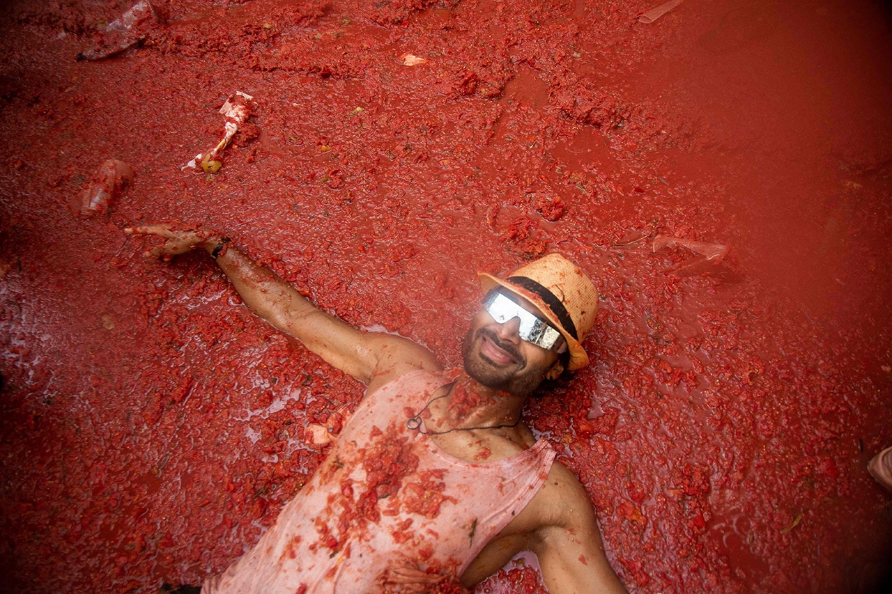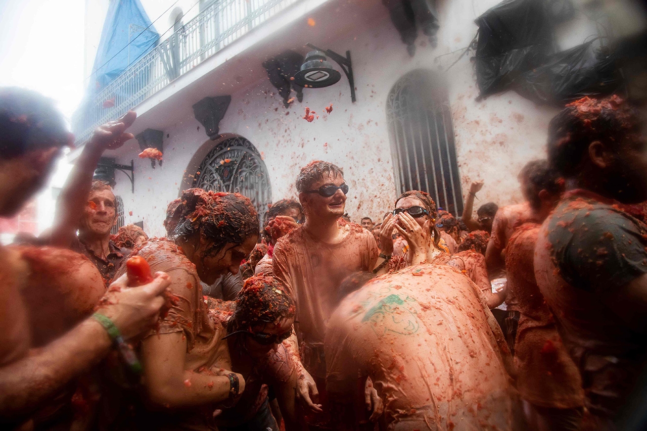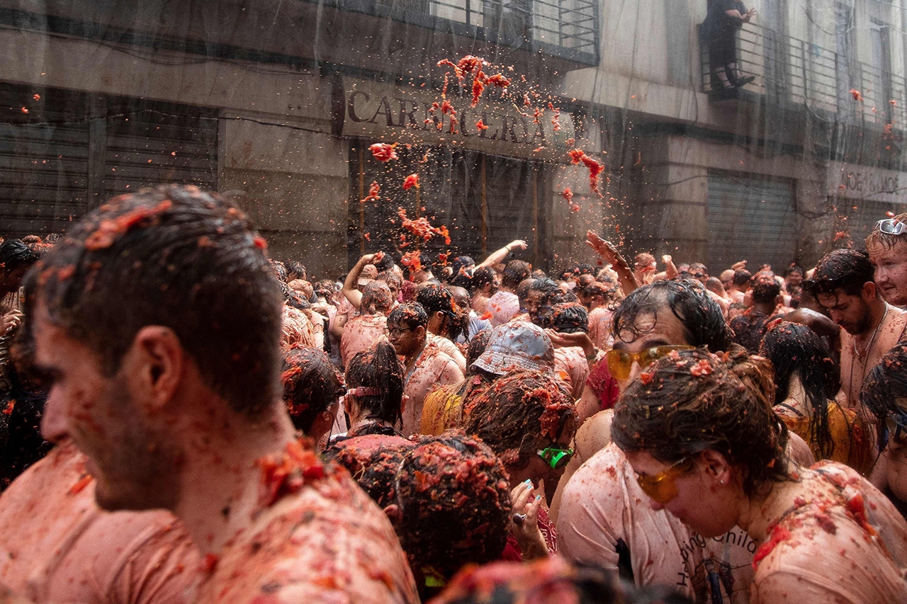 การต่อสู้ด้วยมะเขือเทศบนท้องถนนดำเนินไปอย่างสนุกสนานคึกคัก ผู้เข้าร่วมงานต่างเปียกโชกไปด้วยสีแดงสดของมะเขือเทศ หลายคนต้องใส่แว่นตาว่ายน้ำเพื่อป้องกันน้ำมะเขือเทศเข้าตา และหลังจบงานทุกคนก็ต่างแยกย้ายกันไปอาบน้ำทำความสะอาดร่างกาย
