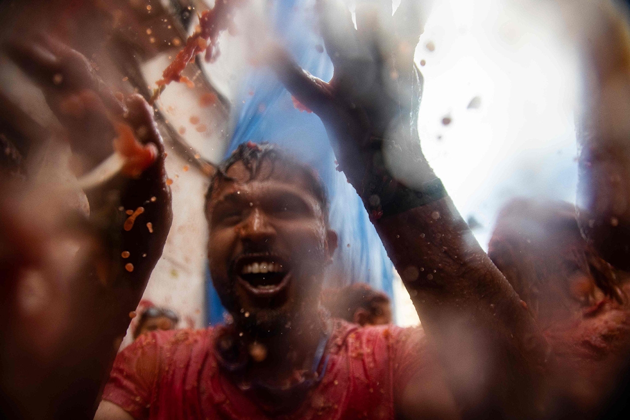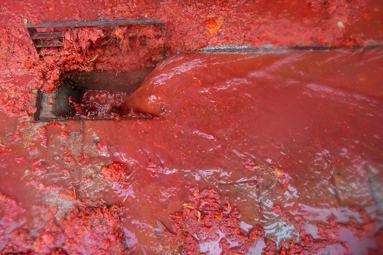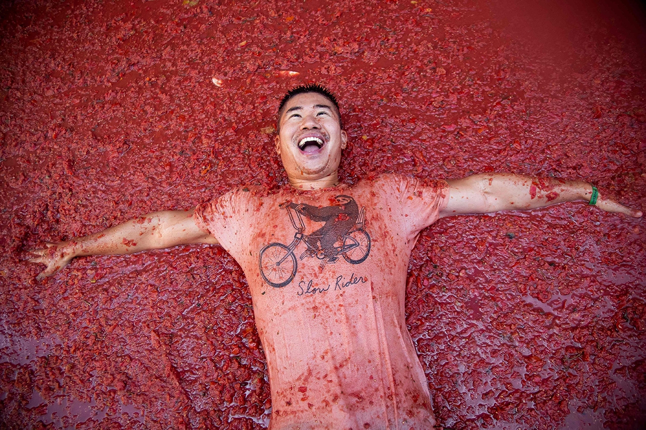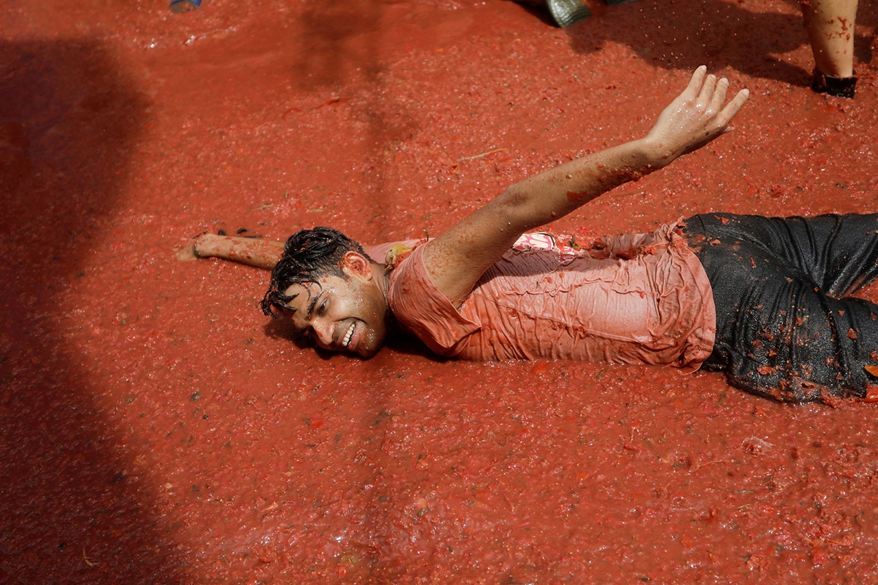 การต่อสู้ด้วยมะเขือเทศบนท้องถนนดำเนินไปอย่างสนุกสนานคึกคัก ผู้เข้าร่วมงานต่างเปียกโชกไปด้วยสีแดงสดของมะเขือเทศ หลายคนต้องใส่แว่นตาว่ายน้ำเพื่อป้องกันน้ำมะเขือเทศเข้าตา และหลังจบงานทุกคนก็ต่างแยกย้ายกันไปอาบน้ำทำความสะอาดร่างกาย