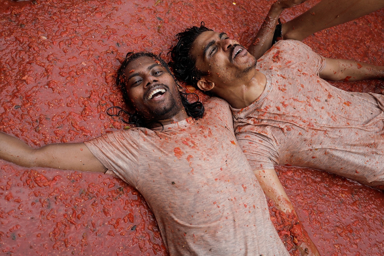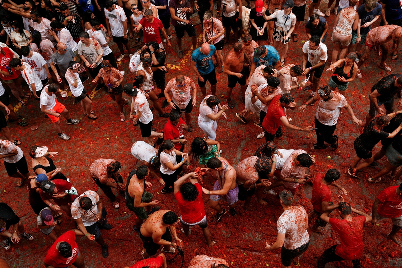 ชาวสเปน และนักท่องเที่ยวกว่า 15,000 คน ร่วมงานเทศกาล “ปามะเขือเทศ” ที่เมืองบูโนล โดยปีนี้ปิดถนนสายหลักของเมืองปามะเขือเทศสดๆ กว่า 120 ตันปาใส่กันอย่างดุเดือด ภาพ REUTERS และ AFP