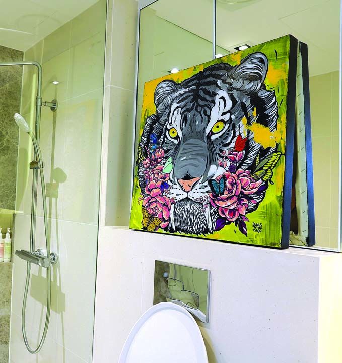 สร้างสรรค์งานศิลป์บน Canvas ขนาดใหญ่กับภาพพญาสิงโตเผือก ในโทนสีขาวดำ ตัดกับพื้นหลังสีสันสดใส เปรียบเสมือนเมืองที่เต็มไปด้วยแสงสีและความมีชีวิตชีวา โดยใช้เทคนิคการพ่นสเปรย์เป็นลวดลายต่างๆ และสีอะคริลิกให้ลูกบ้านและผู้ร่วมงานได้รับชมกันแบบเอ็กซ์คลูซีฟนอกจากนี้ยังได้จับมือกับ Teens of Thailand มารังสรรค์เครื่องดื่มพิเศษให้กับโครงการ ตอกย้ำไลฟ์สไตล์ชีวิตในเมืองของคนรุ่นใหม่