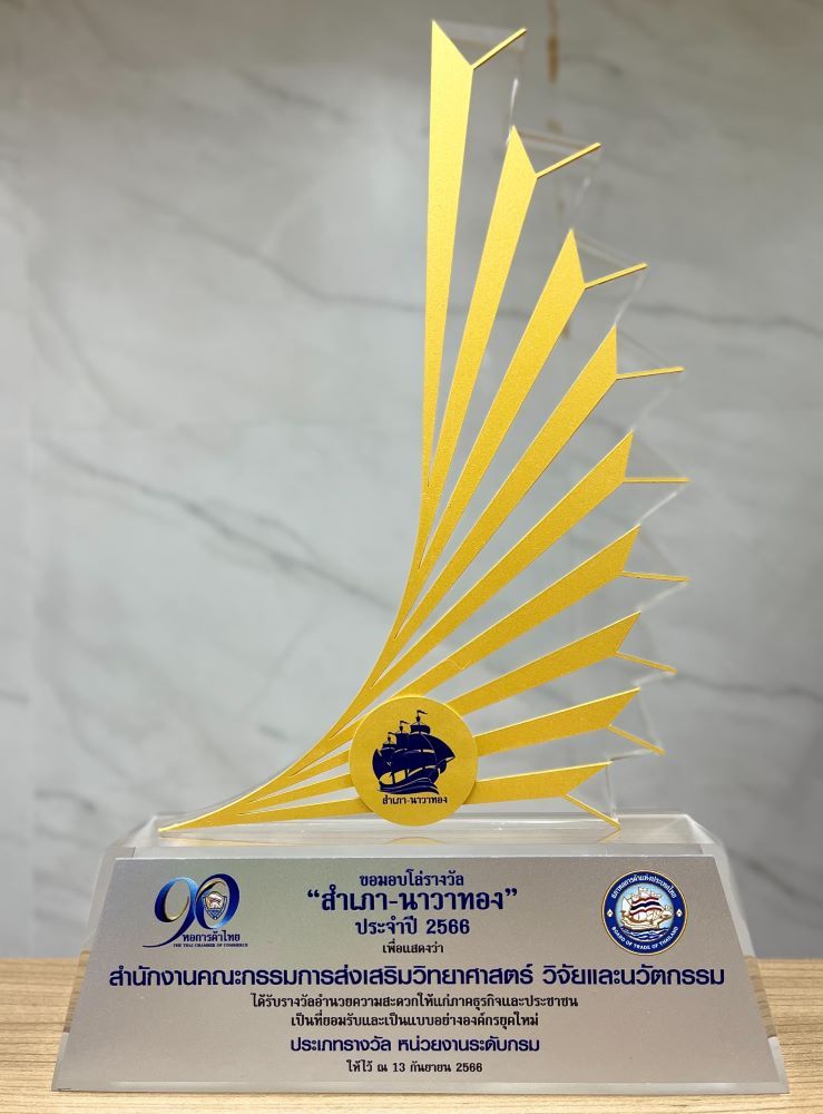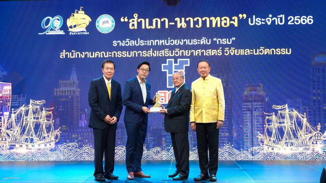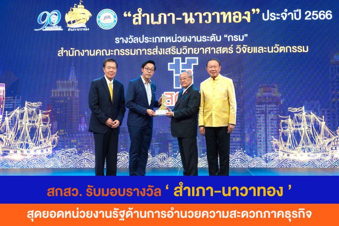 สกสว. เข้ารับมอบรางวัลสุดยอดหน่วยงานรัฐด้านการอำนวยความสะดวกภาคธุรกิจ รางวัล “สำเภา-นาวาทอง” ประจำปี 2566 ระดับกรม เชิดชูหน่วยงานภาครัฐที่ปรับปรุงกระบวนงานอย่างมีประสิทธิภาพ ลดอุปสรรคในการดำเนินธุรกิจอย่างเห็นผล