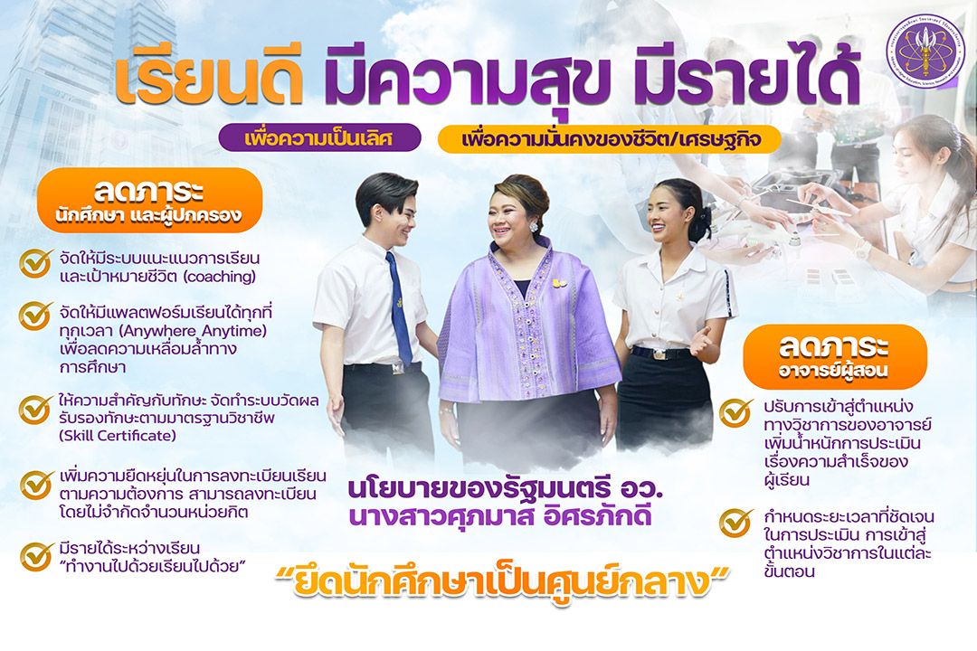 19 กันยายน 2566 ที่กระทรวงการอุดมศึกษา วิทยาศาสตร์ วิจัยและนวัตกรรม(อว.) น.ส.ศุภมาส อิศรภักดี รมว.กระทรวงการอุดมศึกษา วิทยาศาสตร์ วิจัยและนวัตกรรม (อว.) มอบนโยบายการทำงานต่อผู้บริหารอว. ว่า อว. จะมีแนวการดำเนินงานตามนโยบายของรัฐบาลที่ได้แถลงต่อรัฐสภา โดยในด้านการอุดมศึกษา วิจัยและนวัตกรรมจะมุ่งเน้นทั้งเพื่อความเป็นเลิศ และเพื่อความมั่นคงของชีวิตและเศรษฐกิจ โดยนโยบายด้านการอุดมศึกษา จะเน้น “เรียนดี มีความสุข มีรายได้” ให้ยึดนักศึกษาเป็นศูนย์กลาง โดยจะจัดให้มีระบบแนะแนวการเรียน (Coaching) และเป้าหมายชีวิต, จัดให้มีแพลตฟอร์มเรียนได้ทุกที่ทุกเวลา เพื่อลดความเหลื่อมล้ำทางการศึกษา และลดค่าใช้จ่าย ให้ความสำคัญกับการพัฒนาทักษะ โดยเฉพาะหลักสูตรประกาศนียบัตรระยะสั้น (Non-Degree) รวมถึงการจัดทำระบบวัดผลทักษะตามมาตรฐานวิชาชีพ (Skill Certificate), เพิ่มความยืดหยุ่นในการลงทะเบียนเรียนตามความต้องการ สามารถลงทะเบียนโดยไม่จำกัดจำนวนหน่วยกิตในแต่ละภาคการศึกษา พร้อมสนับสนุนให้มีรายได้ระหว่างเรียน หรือ “ทำงานไปด้วยเรียนไปด้วย”
