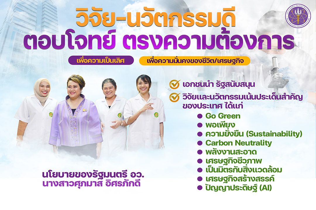 รมว.อว. กล่าวต่อว่า ด้านวิทยาศาสตร์ วิจัยและนวัตกรรม เน้น “วิจัย-นวัตกรรมดี ตอบโจทย์ ตรงความต้องการ” และ “เน้นประเด็นสำคัญของประเทศ อาทิ เรื่องของ Go Green, ความยั่งยืน , ความเป็นกลางทางคาร์บอน , เศรษฐกิจชีวภาพ, เศรษฐกิจสร้างสรรค์ และเทคโนโลยีปัญญาประดิษฐ์ (AI) เป็นต้น รวมทั้งการวิจัยและนวัตกรรมเพื่อขับเคลื่อนเศรษฐกิจและการแก้ไขปัญหาสำคัญของประเทศ โดยตนจะเน้นหลักการสำคัญ คือ “เอกชนนำ รัฐสนับสนุน” โดยให้เอกชนผู้ที่จะใช้ประโยชน์เป็นผู้กำหนดทิศทางว่าควรจะทำเรื่องอะไร อย่างไร แล้วสถาบันวิจัยและมหาวิทยาลัยต่างๆ ของ อว. จะเข้าไปดำเนินการและสนับสนุนอย่างเต็มกำลัง ใช้ความต้องการเป็นตัวนำ (market-driven) พร้อมปลดล็อกระเบียบ ข้อจำกัดต่างๆ นอกจากนี้ อว. จะมุ่งส่งเสริมการสร้างและสนับสนุนผู้ประกอบการนวัตกรรม เพิ่มจำนวนผู้ประกอบการนวัตกรรมทุกระดับ ตั้งแต่ระดับเยาวชน สตาร์ตอัพ SMEs และบริษัทเอกชนขนาดใหญ่
