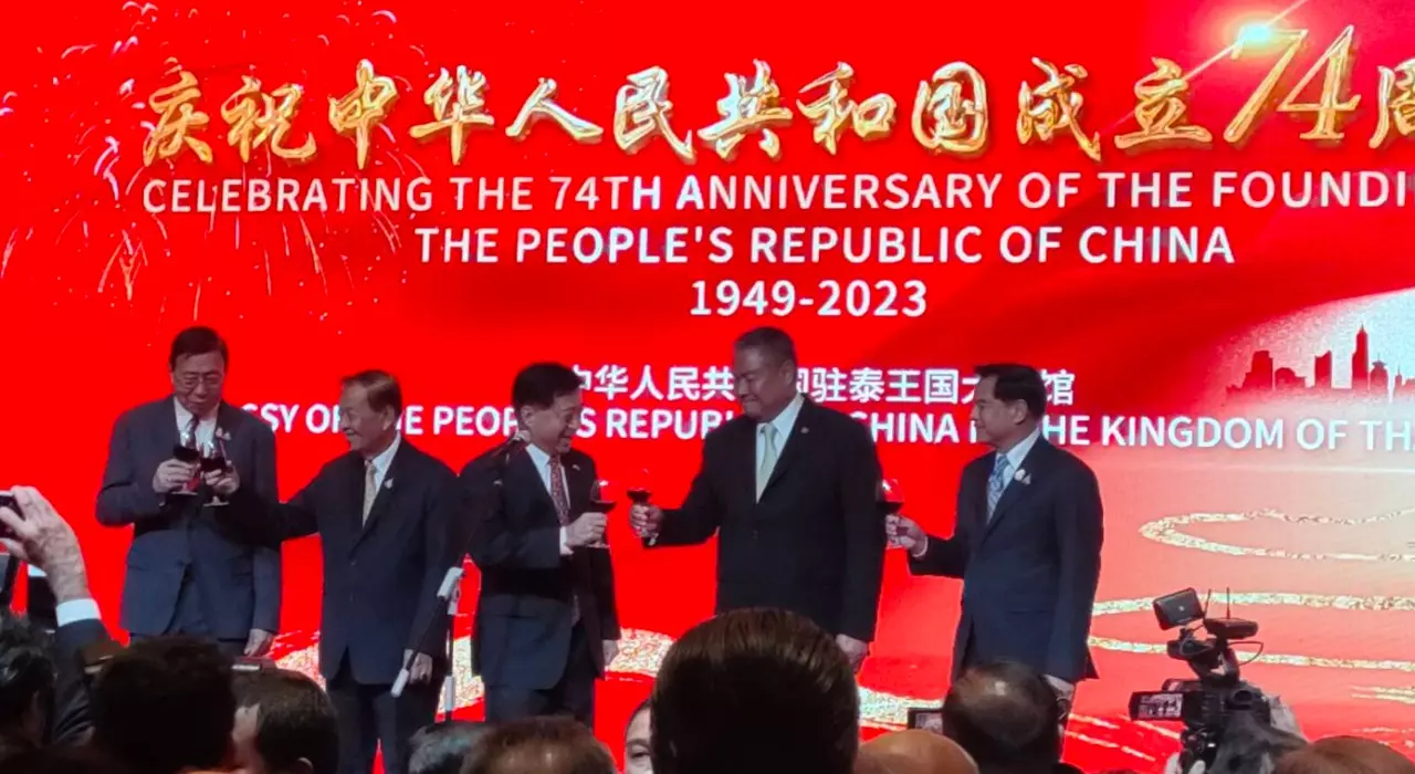 บรรยากาศฉลองครบรอบ 74 ปี วันชาติจีนเป็นไปอย่างชื่นมื่น บุคคลสำคัญแห่แหนเข้าร่วมงานอย่างคึกคัก โดยเอกอัครราชทูตจีนย้ำ จีนพร้อมร่วมงานกับรัฐบาลของนายเศรษฐา ทวีสิน เพื่อความมั่นคงและเดินหน้าพัฒนาประเทศร่วมกันสืบไป