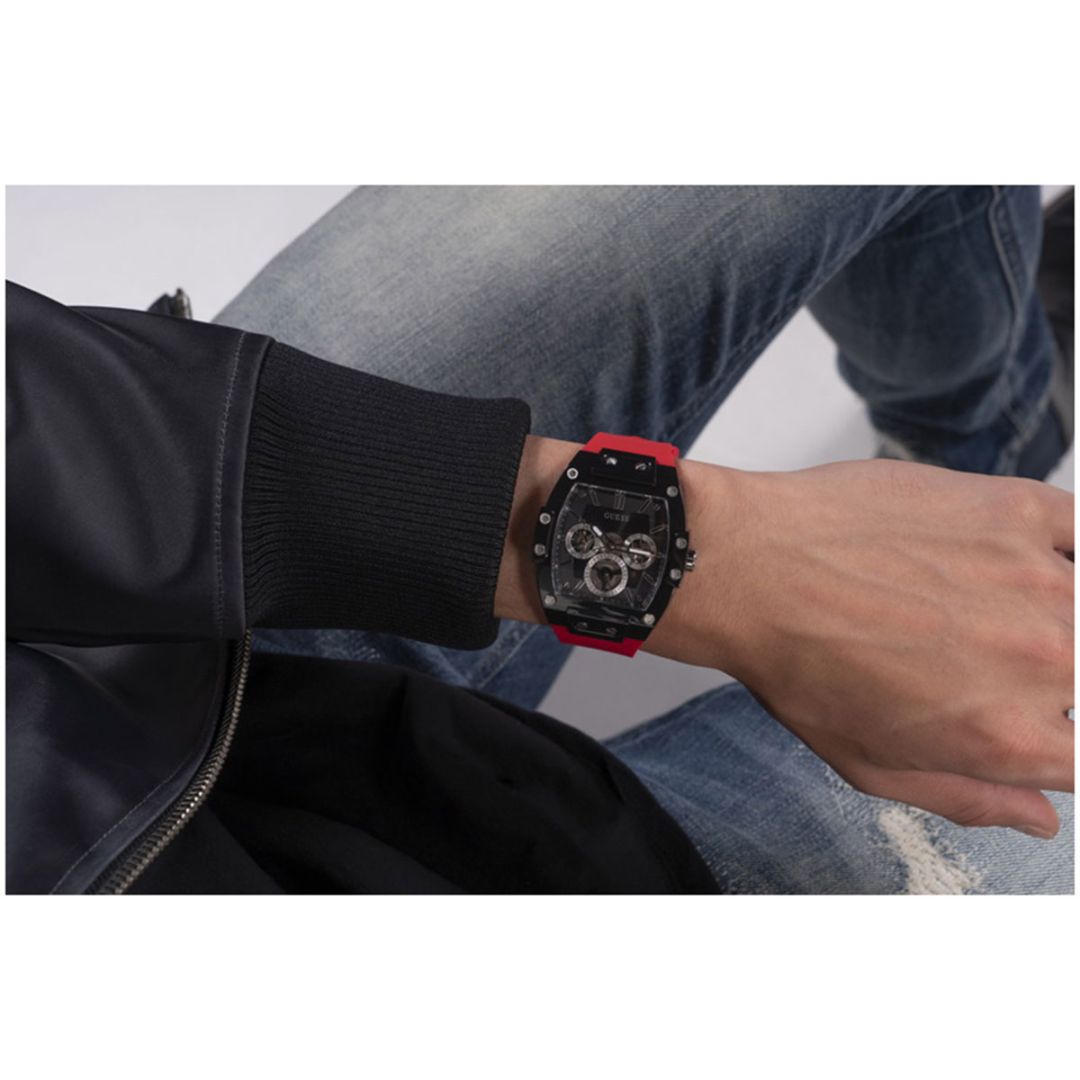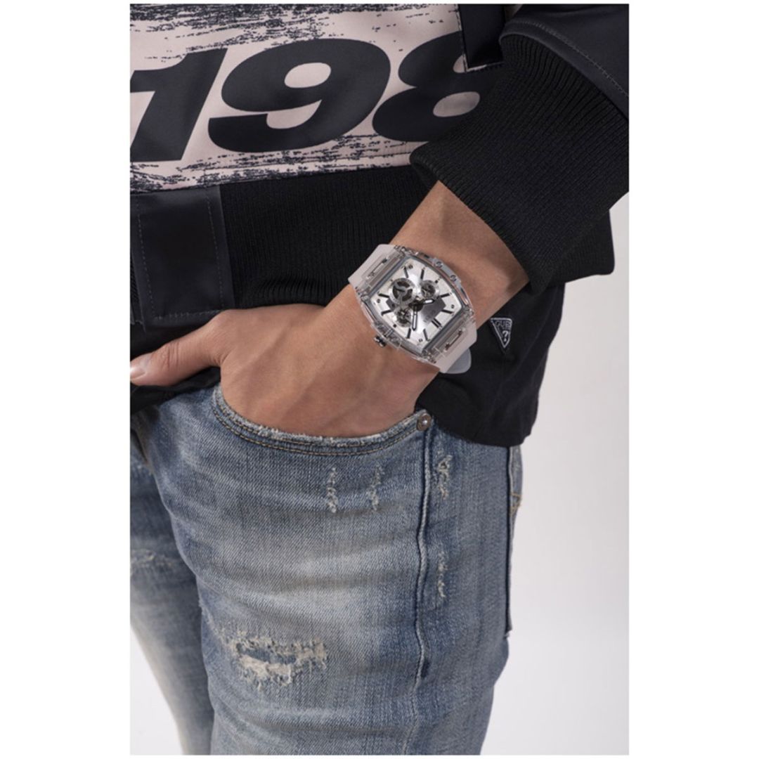 ขณะที่ GUESS ยกทัพนาฬิกาแฟชั่นดีไซน์ใหม่ล่าสุด ประจำคอลเลคชั่น Fall 2023 มาอวดโฉม ทั้งนาฬิกาสำหรับผู้ชาย นำเสนอภาพลักษณ์ของหนุ่มยุคใหม่ผ่านนาฬิการุ่น Phoenix ทรง Tonneau เฉดสีใหม่ล่าสุดที่งานนี้เป็นครั้งแรก ผสมผสานดีไซน์ตัวเรือนและสีสันเท่ๆ แบบสตรีทสไตล์ เข้ากับหน้าปัดแบบ Cut-thru multi-function dial โชว์กลไกภายในตัวเรือนมาพร้อมวัสดุตัวเรือนแบบ Polycarbonateหลากหลายสีสัน น้ำหนักเบา ช่วยให้รู้สึกคล่องตัวและกระชับข้อมือ นาฬิกาสำหรับผู้หญิง GUESS นำเสนอคอลเลคชั่นใหม่ “Pretty in Punk” ที่หยิบเอาดีไซน์ความแสบซ่าสไตล์พังก์มาประดับบนหน้าปัดและสายนาฬิกา ตัวเรือนทำจากวัสดุสีทองสุดหรู ประดับตกแต่งด้วยลวดลาย G Cube Logo และคริสตัลล้อมรอบหน้าปัดแบบจัดเต็ม และตัวเรือนรูปทรง Octagonal ด้วยหน้าปัดดีไซน์เรียบแต่เท่ หยิบแมทช์กับชุดไหนก็ปัง