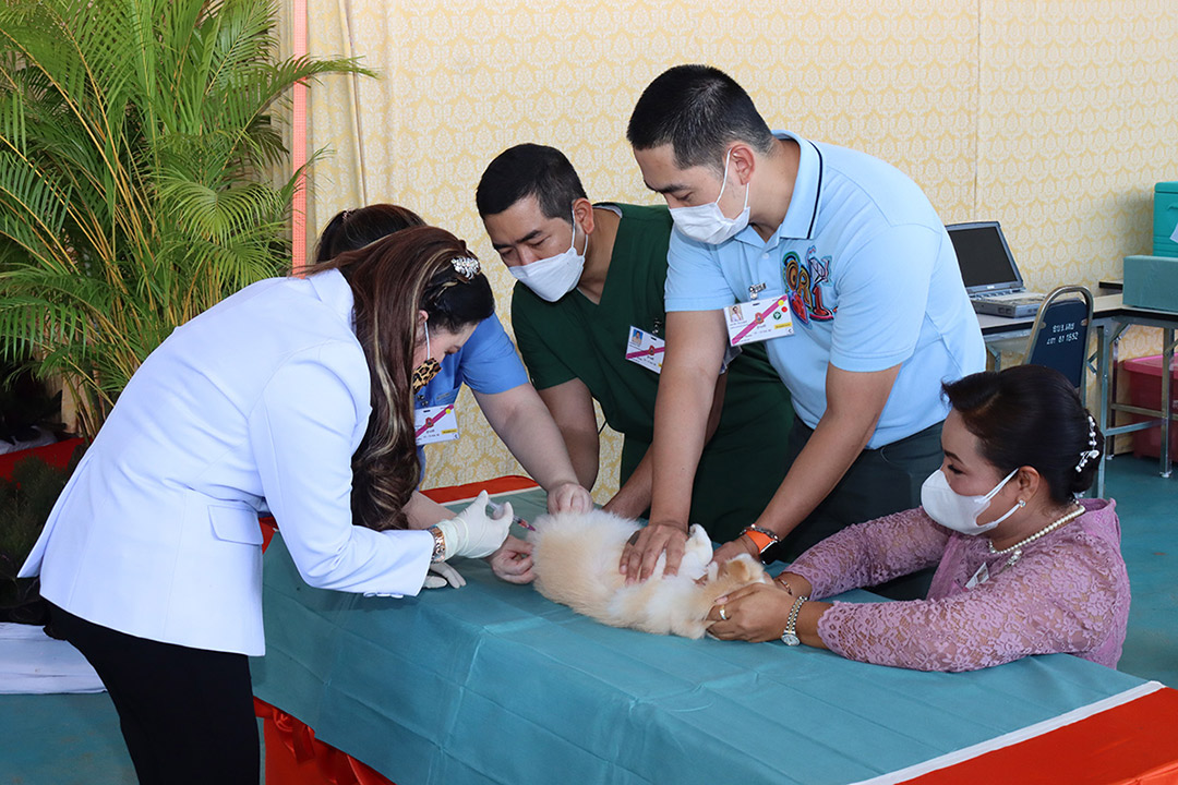 โอกาสนี้ พระราชทานพระวโรกาสให้ ปศุสัตว์จังหวัดเลย และปศุสัตว์จังหวัดอุดรธานี เฝ้ารับพระราชทานวัคซีนป้องกันโรคพิษสุนัขบ้าในสัตว์ เพื่อนำไปฉีดสร้างภูมิคุ้มกันโรคให้กับสุนัขและแมวจรจัดในพื้นที่ทั้ง 2 จังหวัด ซึ่งการฉีดวัคซีนป้องกันโรคพิษสุนัขบ้าก่อนการสัมผัสโรค จึงเป็นอีกทางเลือกหนึ่งที่จะช่วยป้องกันและสร้างความเข้มแข็งในระดับท้องถิ่นให้เป็นเขตปลอดโรคพิษสุนัขบ้าโดยเร็ว