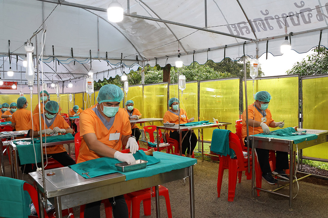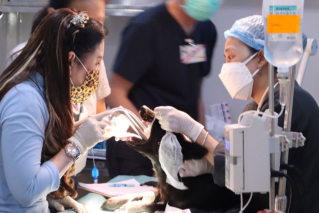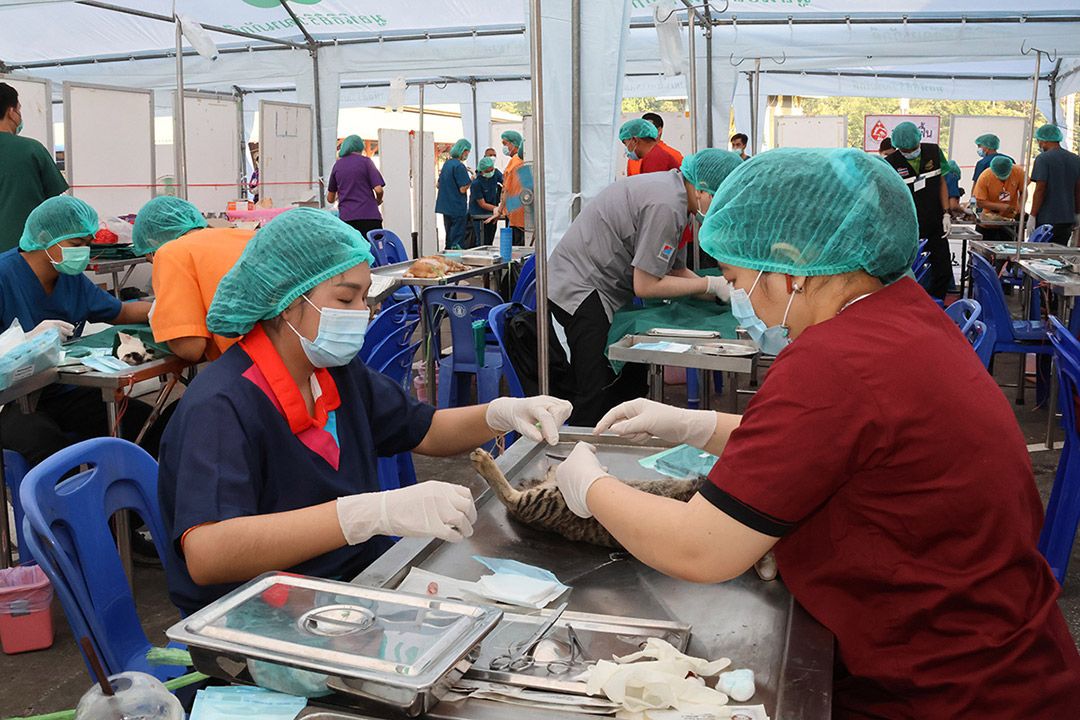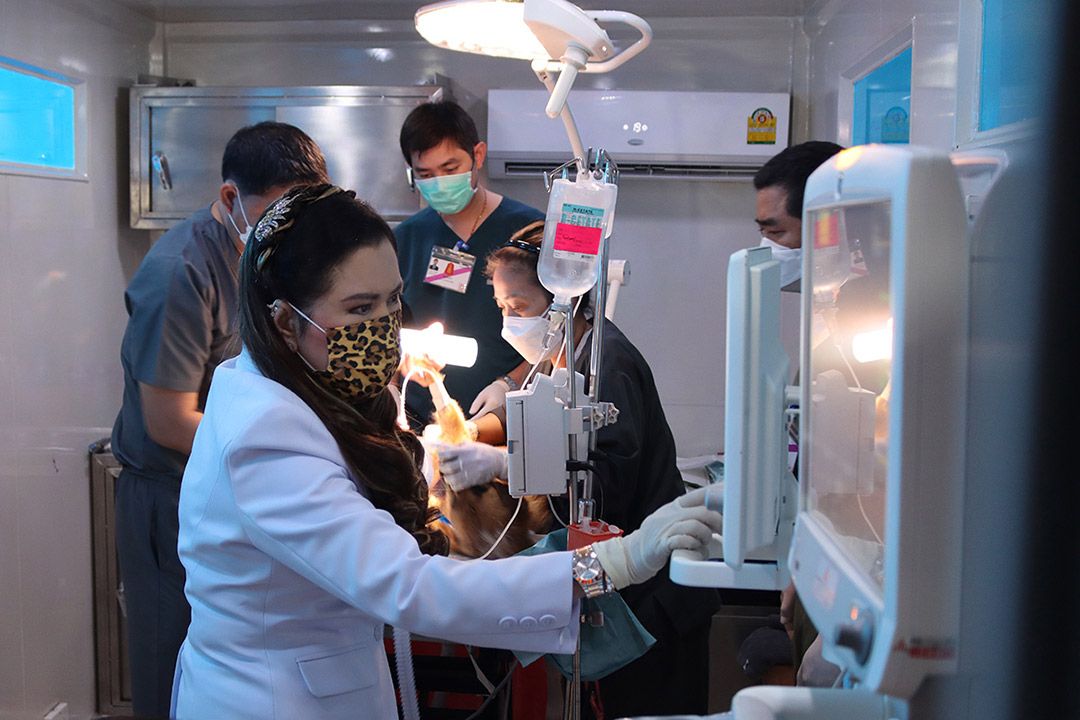ทันทีเมื่อได้เสด็จถึงพื้นที่ออกหน่วยสัตวแพทย์อาสาจุฬาภรณ์ ทรงปฏิบัติพระกรณียกิจร่วมกับทีมสัตวแพทย์อาสาจุฬาภรณ์ ในการฉีดวัคซีนป้องกันโรคพิษสุนัขบ้า และทรงงานวิสัญญีทางสัตวแพทย์ เพื่อวางยาสลบให้แก่สุนัข พร้อมกับทรงติดตามเฝ้าระวังสัญญาณชีพอย่างใกล้ชิด เพื่อทรงประเมินความปลอดภัยระหว่างการผ่าตัดทำหมัน และรักษาโรค ซึ่งหนึ่งในจำนวนนั้นพบว่าเป็นโรคเนื้องอกที่หนังตาจึงทำการบำบัดรักษาโรค ภายในรถผ่าตัดเคลื่อนที่ที่มีมาตรฐานความปลอดภัยและประสิทธิภาพสูง พร้อมด้วยเครื่องมือและอุปกรณ์ทางการสัตวแพทย์อันทันสมัย ที่มาให้บริการช่วยเหลืองานด้านสัตวแพทย์ในพื้นที่ห่างไกลอย่างทั่วถึง