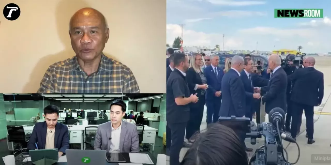 สำหรับกรณีที่ไบเดนไปเยือน กรุงเทลอาวีฟ ตนเชื่อว่าเขาคงพูดอยู่ 2 เรื่อง คือ เขาจะอยู่ข้างยิวนะ และต้องพูดแรงๆ ย้ำไปว่า ทหารอิสราเอลอย่าละเมิดเรื่องสิทธิมนุษยชน เพื่อให้ความสงบกับคนอิสราเอล เพราะมันควรจะมีสันติสุข แต่เมื่อถามว่าจะมีการเปลี่ยนผู้นำ เพื่อนำไปสู่จุดจบของสงครามหรือไม่ ตนเชื่อว่าคนอิสราเอลคงจะไม่เอาคนเดิมแล้ว แต่ตอนนี้เป็นช่วงที่คนออกมาเยอะ อย่าเพิ่งตกใจ พอสงครามมันจบ เราก็จะมองออกได้เองว่ามันจะไปทางไหน แต่ในเรื่องนี้ต้องมองให้ได้ก่อนว่า ระเบิดที่เกิดขึ้นใครเป็นคนทำ