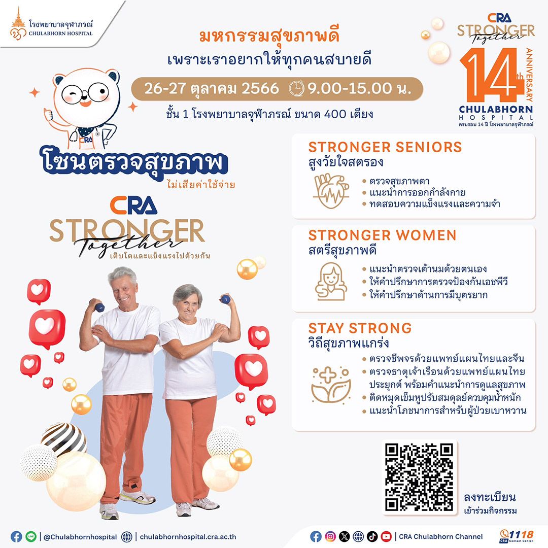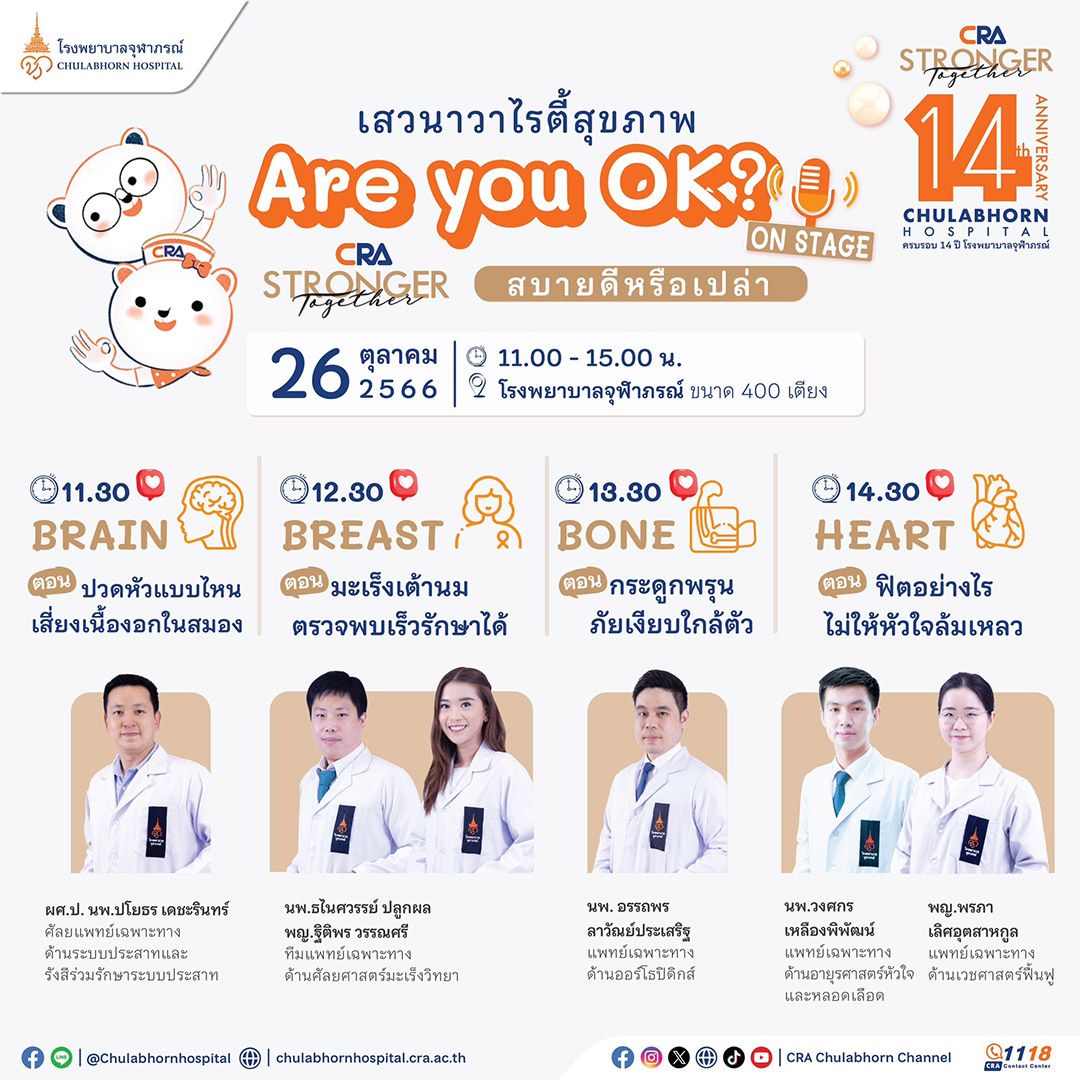 ขอเชิญร่วมงานมหกรรมสุขภาพดี ในงาน CRA STRONGER TOGETHER ครบรอบ 14 ปี โรงพยาบาลจุฬาภรณ์ เติบโตและแข็งแรงไปด้วยกัน ในวันพฤหัสบดีที่ 26 ตุลาคม 2566 เวลา 09.00-15.00 น. ชั้น 1 โรงพยาบาลจุฬาภรณ์ ขนาด 400 เตียง พร้อม ร่วมฟังเสวนาความรู้สุขภาพ “Are you OK? สบายดีหรือเปล่า ON STAGE” @ โรงพยาบาลจุฬาภรณ์ ขนาด 400 เตียง – เวลา 11.30 น. BRAIN ตอน “ปวดหัวแบบไหนเสี่ยงเนื้องอกในสมอง” โดย ผศ.ป. นพ.ปโยธร เดชะรินทร์ ศัลยแพทย์เฉพาะทางด้านระบบประสาทและรังสีร่วมรักษาระบบประสาท