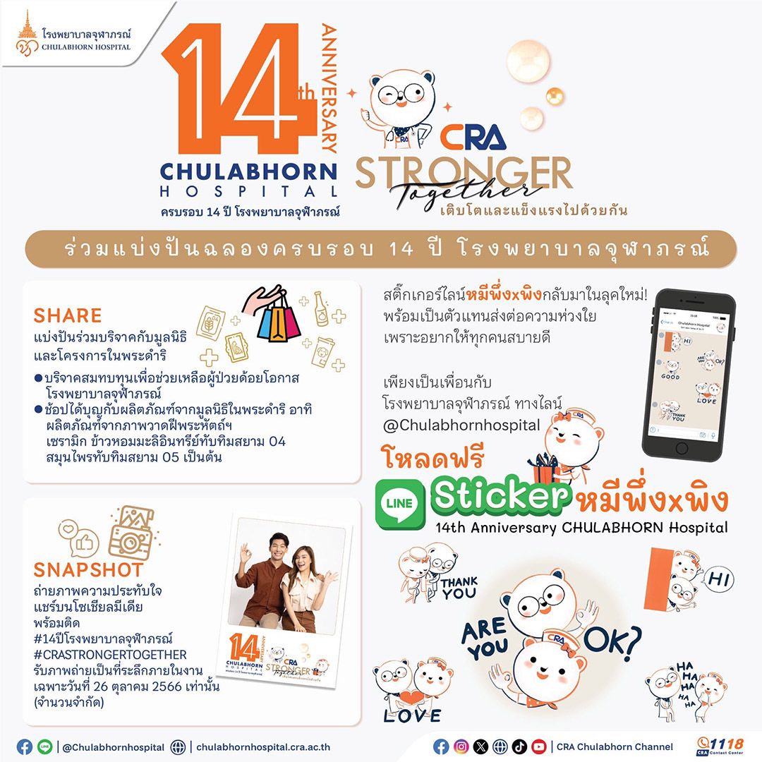 ร่วมฉลองครบรอบ 14 ปี โรงพยาบาลจุฬาภรณ์ เพียงเป็นเพื่อนกับโรงพยาบาลจุฬาภรณ์ทางไลน์ @chulabhornhospital ดาวน์โหลดฟรีที่ LINE Sticker ชุด 14th Anniversary CHULABHORN Hospital น้องหมีพึ่งxพิงกลับมาในลุคใหม่! พร้อมเป็นตัวแทนส่งต่อความห่วงใยเพราะอยากให้ทุกคนสบายดี