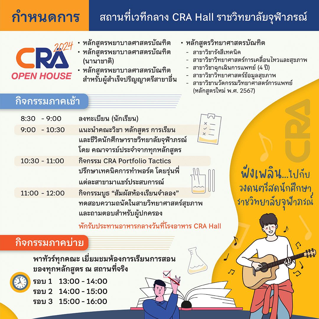 ห้ามพลาด CRA Open House 2024 ครั้งนี้ มีกำหนดจะจัดขึ้นใน วันอาทิตย์ที่ 29 ตุลาคม 2566 เวลา 08:30 – 16:00 น. ณ เวทีกลาง CRA Hall ราชวิทยาลัยจุฬาภรณ์ เขตหลักสี่ กรุงเทพมหานคร โดยจะตรียมมอบประสบการณ์การมีส่วนร่วมและให้ความรู้แก่ผู้เข้าร่วมที่สนใจประกอบอาชีพในสาขาพยาบาลศาสตร์และสาขาวิทยาศาสตร์สุขภาพอย่างเข้มข้น ข้อมูลเพิ่มเติม WWW.CRA.AC.TH FACE BOOK : CRAPCCMS