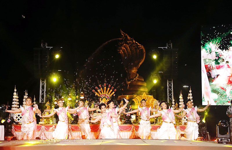 แต่ไฮไลท์ความงดงาม ที่สายตาทุกคู่ต่างจับจ้อง อยู่ที่ สองนักแสดงนำ จากละครฟอร์มใหญ่ “พนมนาคา” นำโดย “กรีน-อัษฎาพร สิริวัฒน์ธนกุล” ผู้รับบท“อนัญชลี” (ผู้มีฤกษ์เกิดปีงูใหญ่ เหมาะสมกับการเป็นคู่ครองของพญานาค) และ “ญิ๋งญิ๋ง-ศรุชา เพชรโรจน์” ผู้รับบท “โสวันนี” (นาคบริวาร) แต่งกายด้วยชุดรำสุดสง่างาม เรียบง่าย แต่ออร่าความสวย สุดเจิดจรัส นำขบวนร่ายรำบวงสรวง ถวาย “องค์ปู่ศรีสัตตนาคราช” โดยใช้เพลงรำจาก ละคร “พนมนาคา” ทำให้เพิ่มกลิ่นอายความมีมนต์ขลังอย่างลงตัว ทั้งนี้ ยังมีขบวนรำถวายของจังหวัดนครพนม เข้าร่วมฟ้อนศรีโคตรบูร และฟ้อนออนซอนนครพนม ซึ่งเป็นประเพณีการฟ้อนที่อ่อนช้อย งดงาม ตามด้วย พิธีขอขมากรรมที่เข้มขลังไปด้วยแรงศรัทธา และปิดท้ายงาน ด้วยภาพสุดประทับใจกิจกรรมการบินโดรนแปลอักษรในงานประเพณีไหลเรือไฟ จังหวัดนครพนม เรียกเสียงฮือฮา และแสงแฟลชได้ตลอดการแสดง จากนั้น แฟนละครจำนวนมาก ปักหลักร่วมชมละคร “พนมนาคา” กลางลานพญาศรีสัตตนาคราช ท่ามกลางบรรยากาศที่เต็มไปด้วยมนต์เสน่ห์แห่งความรัก ความศรัทธา