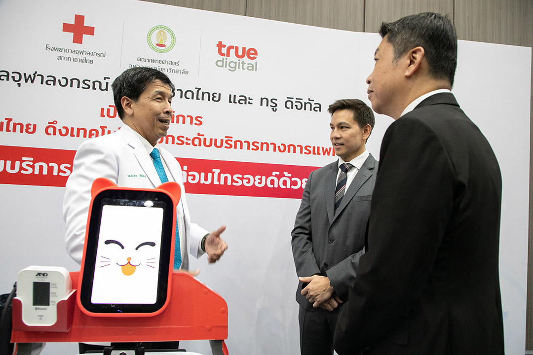 นายเอกราช ปัญจวีณิน หัวหน้าคณะผู้บริหารด้านดิจิทัล บมจ.ทรู คอร์ปอเรชั่น กล่าวว่า ทรู ดิจิทัล มุ่งมั่นพัฒนานวัตกรรมดิจิทัล เพื่อยกระดับการใช้ชีวิตของคนไทยให้ดียิ่งขึ้น และเพิ่มประสิทธิภาพขีดความสามารถของภาคอุตสาหกรรมต่างๆ ส่งเสริมเศรษฐกิจดิจิทัลที่เข้มแข็ง ตลอดจนเสริมสร้างสังคมไทยให้เติบโตอย่างมั่นคงและยั่งยืน สะท้อนวิสัยทัศน์ของทรู คอร์ปอเรชั่น ในฐานะผู้นำบริษัทโทรคมนาคม-เทคโนโลยี (Telecom-Tech Company) ซึ่งการพัฒนานวัตกรรม “หุ่นยนต์อัจฉริยะช่วยบริการรักษามะเร็งต่อมไทรอยด์ด้วยสารรังสีไอโอดีน” ภายใต้ความร่วมมือกับโรงพยาบาลจุฬาลงกรณ์ สภากาชาดไทย ในครั้งนี้ นับเป็นอีกหนึ่งความภาคภูมิใจของทรูที่ได้ต่อยอด นำประสบการณ์จากการทำงานและพัฒนานวัตกรรมร่วมกับทีมแพทย์ของไทยมาอย่างยาวนาน ผสานความรู้ ความเชี่ยวชาญ เทคโนโลยีและระบบนิเวศดิจิทัลครบวงจรของทรู เข้ากับองค์ความรู้ของแพทย์ในโรงเรียนแพทย์ระดับแนวหน้าของประเทศ เพื่อยกระดับการให้บริการทางการแพทย์ได้สำเร็จอีกครั้ง ก่อเกิดนวัตกรรมในการให้บริการทางการแพทย์ในยุคดิจิทัลที่ก้าวล้ำมากกว่าที่เคยมีมา และเป็นครั้งแรกของไทยในการพัฒนาหุ่นยนต์สนับสนุนการให้บริการด้านเวชศาสตร์นิวเคลียร์ โดยหุ่นยนต์สามารถช่วยบุคลากรทางการแพทย์ ทั้งการให้บริการผู้ป่วย ควบคู่กับการมีบทบาทสำคัญ คือ การเพิ่มความปลอดภัยให้แก่บุคลากรทางการแพทย์ ลดปริมาณรังสีที่จะได้รับโดยตรงจากการปฏิบัติงานประจำในการรักษาผู้ป่วยโรคมะเร็งต่อมไทรอยด์ จึงช่วยลดความเสี่ยงที่อาจจะเกิดโรคจากการที่ได้รับรังสีสะสมในร่างกายเป็นระยะเวลานานๆ ช่วยให้แพทย์และพยาบาลสามารถดูแลผู้ป่วยได้จำนวนมากขึ้น ขณะที่ยังคงให้บริการได้อย่างใกล้ชิดและมีประสิทธิภาพมากยิ่งขึ้น เชื่อมั่นว่า นวัตกรรมที่เกิดจากความร่วมมือในครั้งนี้ จะเป็นอีกหนึ่งพัฒนาการสำคัญของการให้บริการรักษามะเร็งต่อมไทรอยด์ด้วยสารรังสีไอโอดีนในประเทศไทย และทรู ดิจิทัล จะเดินหน้าต่อยอดความสามารถของหุ่นยนต์ให้ก้าวล้ำยิ่งขึ้น รวมถึงสานต่อความร่วมมือ ขยายการใช้งานให้แพร่หลายในวงกว้างมากขึ้น เพื่อสนับสนุนความก้าวหน้าของวงการการแพทย์และยกระดับบริการสาธารณสุขของไทย ตลอดจนเติมเต็มวิถีชีวิตในยุคดิจิทัล และสร้างคุณค่าต่อคนไทย เศรษฐกิจ และสังคมไทยอย่างต่อเนื่องต่อไป