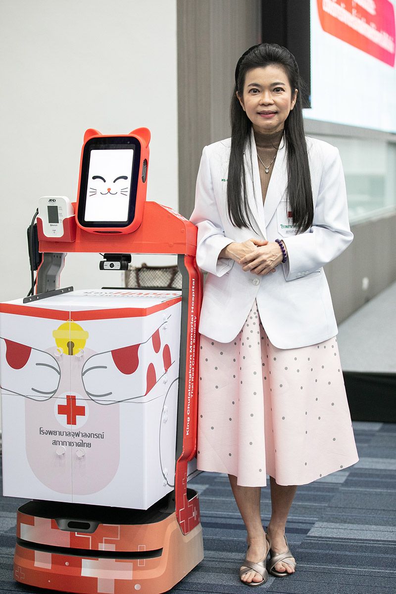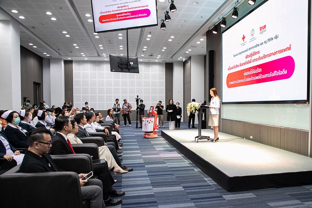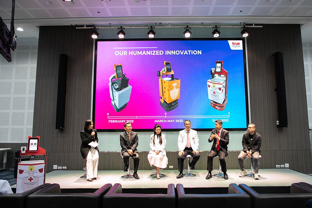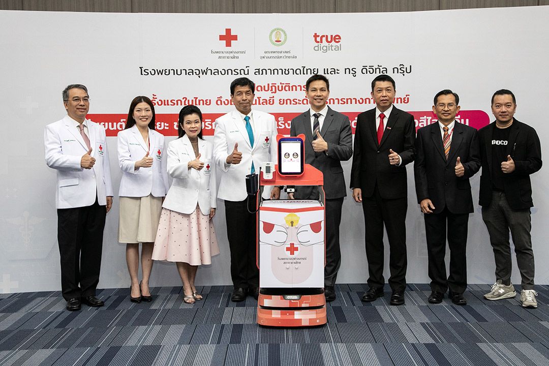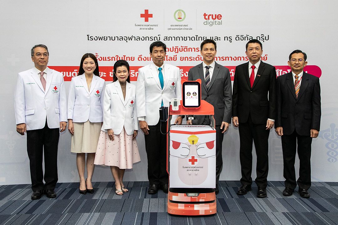 26 ตุลาคม 2566 โรงพยาบาลจุฬาลงกรณ์ สภากาชาดไทย ร่วมกับ ทรู ดิจิทัล กรุ๊ป นำเทคโนโลยีดิจิทัล ยกระดับการให้บริการทางการแพทย์ให้ก้าวล้ำไปอีกขั้น พัฒนานวัตกรรมสนับสนุนการบริการในการรักษาโรคมะเร็งต่อมไทรอยด์ เป็นครั้งแรกของไทยในการนำหุ่นยนต์มาใช้ในงานด้านเวชศาสตร์นิวเคลียร์ ช่วยเพิ่มประสิทธิภาพการให้บริการผู้ป่วยโรคมะเร็งต่อมไทรอยด์ด้วยสารรังสีไอโอดีน ที่สำคัญยังมีส่วนในการช่วยแพทย์และบุคลากรทางการแพทย์ ลดปริมาณรังสีที่จะได้รับโดยตรงในระหว่างให้การรักษาผู้ป่วย จึงช่วยเพิ่มความปลอดภัยต่อสุขภาพ ตลอดจนลดความเสี่ยงและโอกาสที่อาจจะเกิดโรคจากการได้รับรังสีสะสมเป็นระยะเวลานานๆ โดย “หุ่นยนต์อัจฉริยะช่วยบริการรักษามะเร็งต่อมไทรอยด์ด้วยสารรังสีไอโอดีน” พัฒนาฟังก์ชันตามความต้องการใช้งานของบุคลากรทางการแพทย์ ไม่ว่าจะเป็นการขนส่งสารรังสีไอโอดีน อาหาร ยาและเวชภัณฑ์แก่ผู้ป่วย การแพทย์ระยะไกล วัดสัญญาณชีพ และตรวจวัดการเปรอะเปื้อนรังสีในพื้นที่ให้บริการหลังจากผู้ป่วยออกจากโรงพยาบาล ทั้งยังออกแบบโดยผสานความเป็นมนุษย์และเทคโนโลยีเข้าด้วยกัน หรือ Human-Tech Technology ในแนวคิด Humanize มีดีไซน์หน้าจอและสีสันที่เป็นมิตรกับผู้ใช้งาน มาพร้อมเสียงที่น่าฟัง ช่วยสร้างสัมผัสและปฏิสัมพันธ์แบบคล้ายมนุษย์ นับเป็นนวัตกรรมที่สร้างประโยชน์และคุณค่าหลากหลายมิติสำหรับวงการแพทย์และสาธารณสุขไทย ยกระดับการให้บริการทางการแพทย์ ด้วยการใช้เทคโนโลยีหุ่นยนต์อำนวยความสะดวกและให้บริการผู้ป่วย ควบคู่กับการปกป้องดูแลสุขภาพของบุคลากรการแพทย์ เพิ่มศักยภาพและขีดความสามารถในการดูแลและรักษาผู้ป่วยได้มากขึ้น อีกทั้งยังสามารถต่อยอดฟังก์ชันของหุ่นยนต์ให้ครอบคลุมมากขึ้น รวมถึงกระตุ้นและขยายการใช้หุ่นยนต์และเทคโนโลยีดิจิทัลเพื่อการแพทย์ให้แพร่หลายและกว้างขวางมากขึ้น ตอกย้ำความมุ่งมั่นของทรู ผู้นำเทเลคอม-เทคคอมปานี ที่มุ่งสร้างสรรค์นวัตกรรมเทคโนโลยีดิจิทัล เพื่อสร้างประโยชน์สูงสุดแก่คนไทย สังคม และประเทศไทย