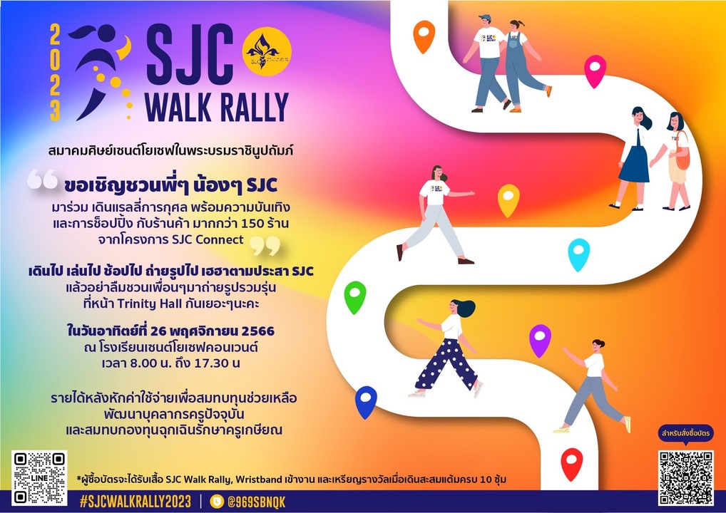 ดร. กนกวรรณ ว่องวัฒนะสิน นายกสมาคมศิษย์เซนต์โยเซฟในพระบรมราชินูปถัมภ์เตรียมจัดงาน SJC Walk Rally 2023 แรลลี่การกุศล เพื่อหารายได้สมทบทุนช่วยเหลือพัฒนาบุคลากรครูปัจจุบันและสมทบทุนกองทุนฉุกเฉินรักษาครูเกษียณ (หลังหักค่าใช้จ่ายแล้ว) ในวันอาทิตย์ที่ 26 พฤศจิกายน 2566 เวลา 8.00 น. ถึง 17.30 น ณ โรงเรียนเซนต์โยเซฟคอนเวนต์ ภายในงานมีบูธจำหน่ายสินค้ามากมายจากร้านดังศิษย์เก่า SJC CONNECT กว่า 100บูธ! ศิษย์เก่า และศิษย์ปัจจุบันที่สนใจ สามารถซื้อบัตรเข้างานได้ที่ https://forms.office.com/r/BXNSACgw14 ตั้งแต่วันนี้จนถึงวันที่ 5 พ.ย. 2566 ข้อมูลเพิ่มเติมติดต่อ Line OA : @969sbnqk