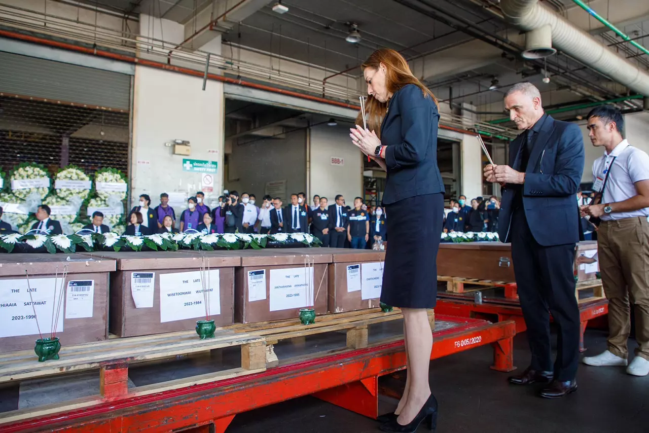 ที่อาคารคลังสินค้าระหว่างประเทศ ท่าอากาศ ยานสุวรรณภูมิ เมื่อเวลา 13.30 น. วันที่ 1 พ.ย.นางออร์นา ซากิฟ เอกอัครราชทูตอิสราเอลประจำประเทศไทย นายไพโรจน์ โชติกเสถียร ปลัดกระทรวงแรงงาน นายอารี ไกรนรา เลขานุการ รมว.แรงงาน ร่วมรับร่าง 11 แรงงานไทยที่เสียชีวิตจากสงครามอิสราเอลและกลุ่มฮามาส ที่ถูกส่งกลับไทยโดยสายการบิน EI AI ISRAEL AIRLINES เที่ยวบินที่ LY083 และเที่ยวบินนี้ยังมีคนไทย 43 คนกลับมาด้วย โดยนางออร์นาทูตและคณะฝ่ายไทยได้วางหรีดดอกไม้เคารพศพ ก่อนส่งร่างผู้เสียชีวิตทั้งหมดกลับภูมิลำเนาของแต่ละคน