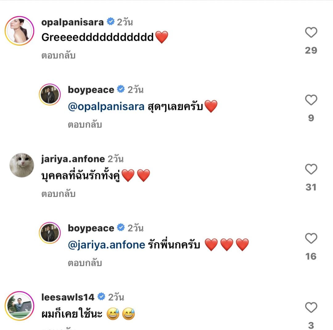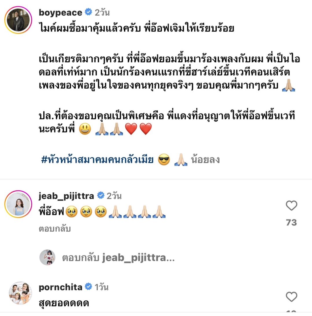 ซึ่งหลังจากร้องเพลงท่อนวรรคทองจบลง “หนุ่มบอย” ถึงกับคุกเข่าชาบู ขอคารวะให้กับไอดอลในดวงใจ โดยมีเพื่อนพ้องในวงการเข้ามาคอมเมนต์ไปกับเรื่องราวสุดประทับใจมากมาย อาทิ “เบนซ์ พรชิตา” ที่มาคอมเมนต์ว่า “สุดยอดดดด” พร้อมด้วย “นก จริยา ว่า “บุคคลที่ฉันรักทั้งคู่” และ “โอปอล์ ปาณิสรา” ที่เข้ามาแสดงคิดเห็นว่า “Greeeedddddddddd❤️” ร่วมไปถึงภรรยาสุดที่รักอย่าง “เจี๊ยบ พิจิตตรา” ที่มาให้กำลังใจสามีกับคอมเมนต์ “พี่อ๊อฟ????????????????” ซาบซึ้งไปกับเหตุการณ์สุดฟินของคุณสามี