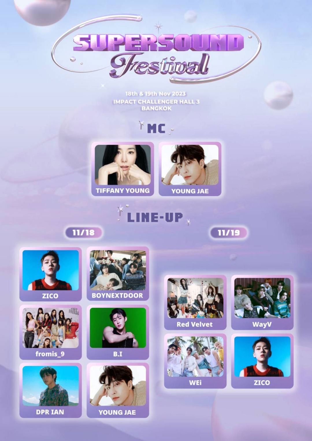 สำหรับงาน “Supersound Festival Thailand 2023” มีทัพศิลปินเกาหลีมาสนุกกับแฟนเพลงกันถึง 2 วัน ซึ่งแฟนๆ K-Pop จะต้องไม่พลาด เพราะเป็นการรวมตัวกันของศิลปินเกาหลีที่คัมแบ๊กสเตจ มากที่สุดเท่าที่เคยจัดมาในประเทศไทย ให้ผู้ชมได้สนุกกันถึง 2 วันในเวทีเดียวกัน ไม่ว่าจะเป็น YOUNGJAE GOT7ที่เพิ่งจะประกาศการคัมแบ๊กด้วยอัลบั้มเต็มชุดแรก Do itหรือการคัมแบ๊กอีกครั้งในรอบ 6 ปีเต็ม ของเกิลกรุ๊ป Red Velvet เสริมทัพความสนุกด้วยบอยแบนด์อย่าง WayV/WEi และ BOYNEXTDOOR และอีกมากมาย โดยมี Tiffany Young SNSD และ YOUNGJAE GOT7 ร่วมเป็น MC ของทั้ง 2 วันอีกด้วย