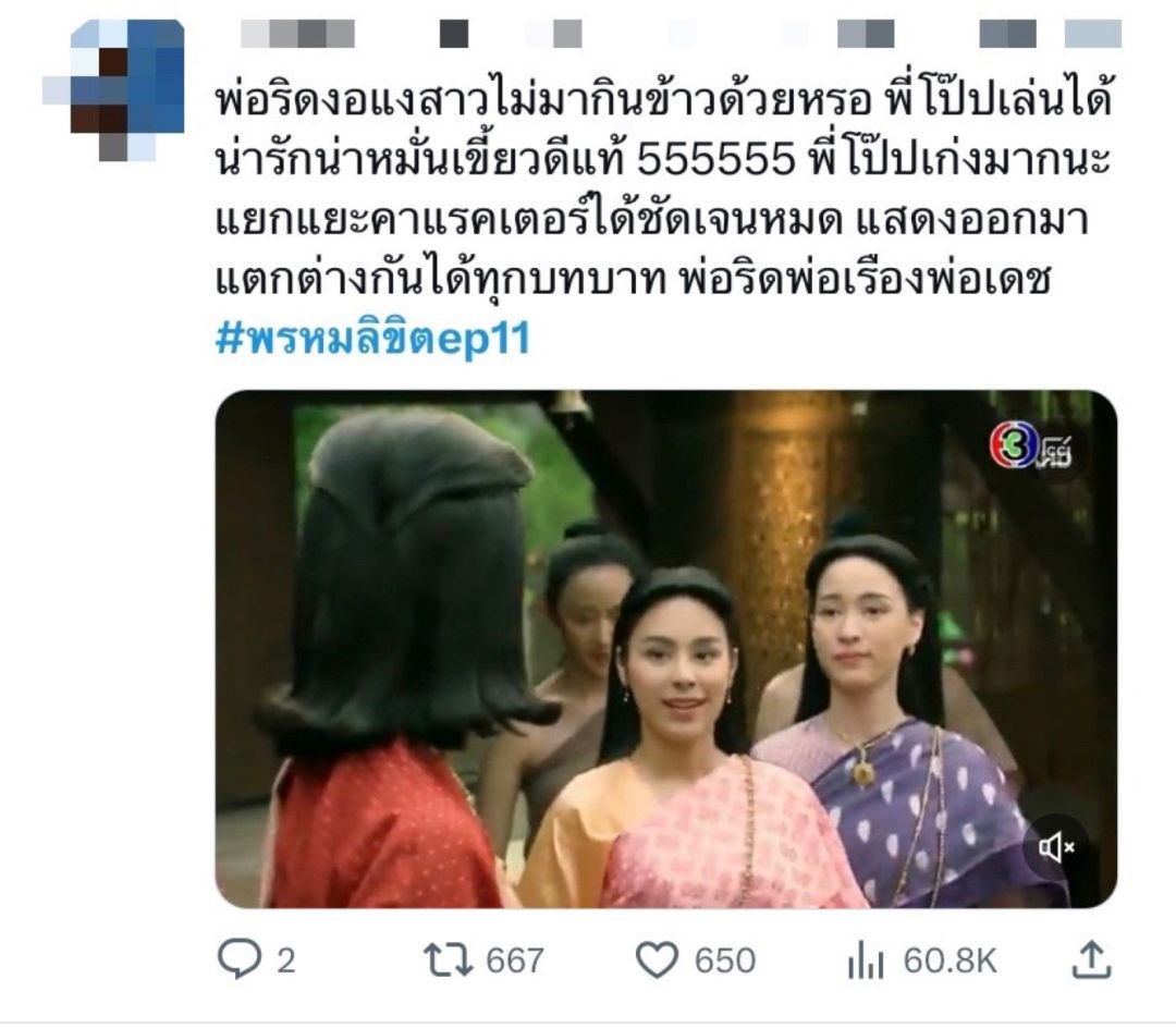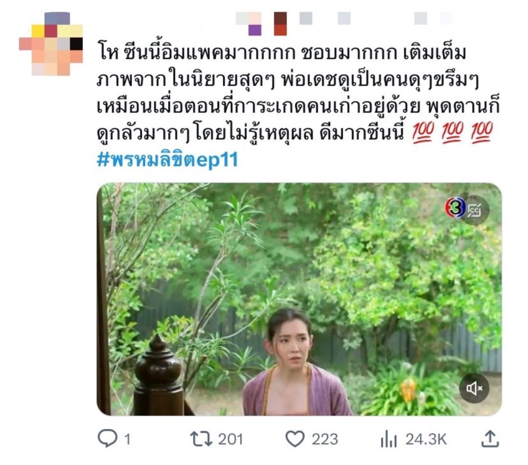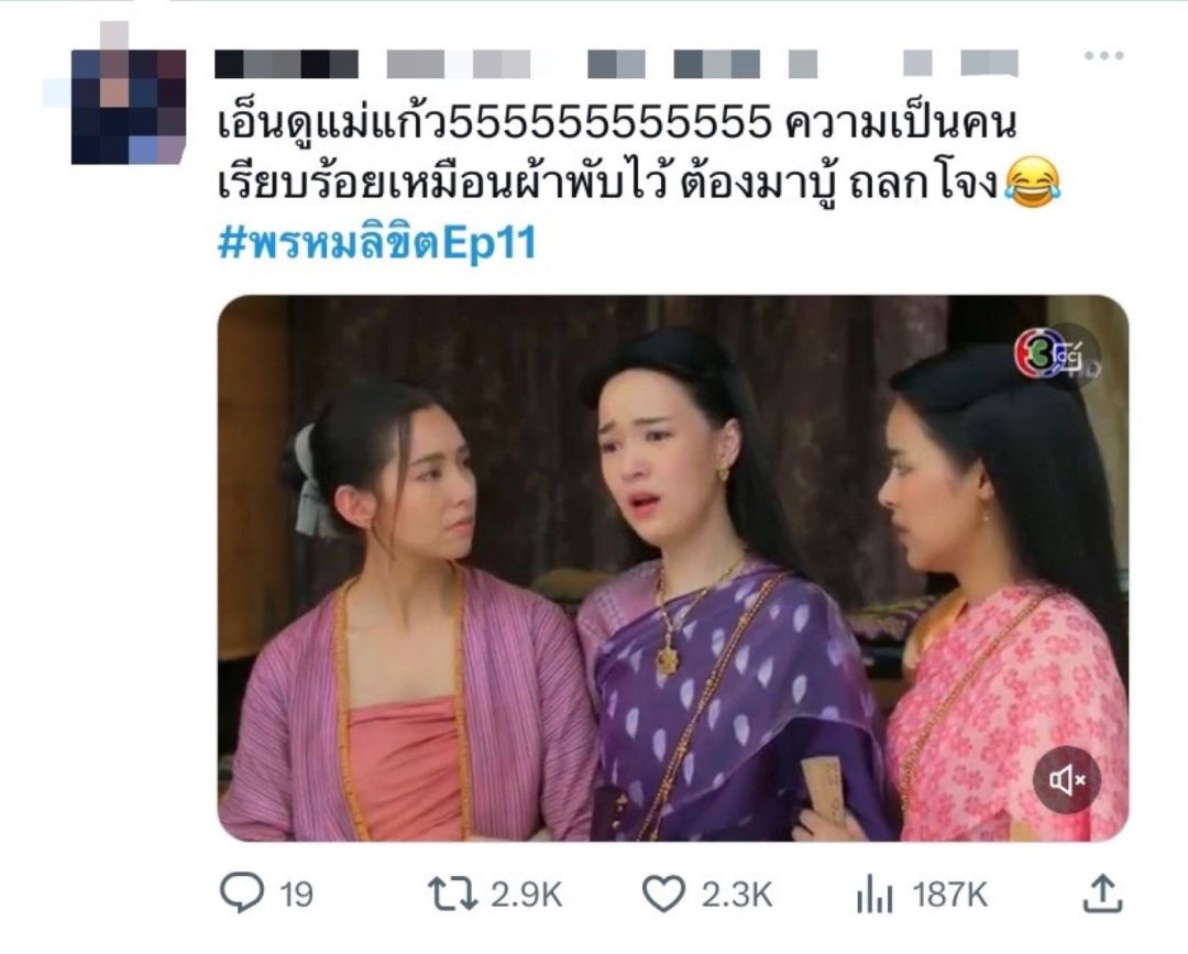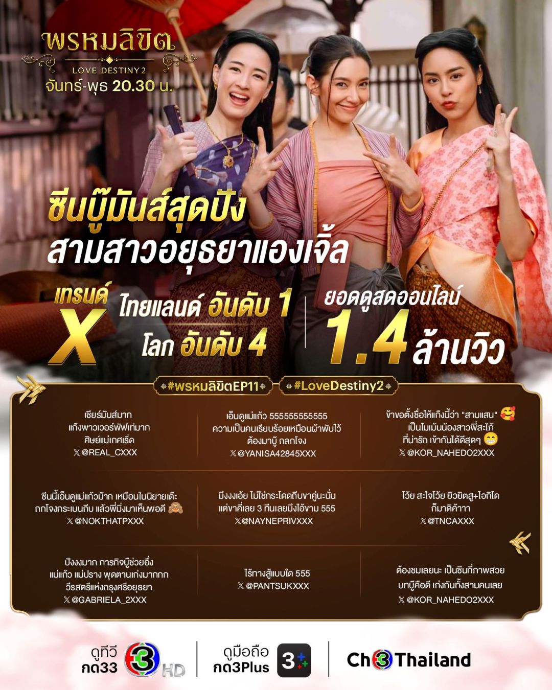 ทำลายสถิติแรงทุกอีพีจริงๆ สำหรับละคร“พรหมลิขิต”ล่าสุดกวาดเรตติ้งทั่วประเทศไปถึง 7.34 ในกลุ่มผู้ชมกรุงเทพฯ ทำไปได้13.36 ส่วนกลุ่มผู้ชมอายุ 15 ปี ขึ้นไป หรือ กลุ่ม 15 BU+ (Bangkok and Urban) พุ่งไปถึง 10.93รวมทั้งยอดดูสดออนไลน์ก็พุ่งสูงถึง 1.4 ล้านคนยอดดูย้อนหลังผ่าน 3Plus ทำไปได้สูงถึง47.7ล้านคนแถมยังอาละวาดแรงไม่หยุดในโลกโซเชียลกับแฮชแท็กละคร #พรหมลิขิตEp11จนติดเทรนด์ทวิตเตอร์(X)ไทยแลนด์ อันดับ 1 และเทรนด์โลก อันดับ 4 เรียกว่ามีฉากเด็ดปล่อยของออกมาให้เซอร์ไพรส์คนดูตลอด ซึ่งล่าสุดพักพาร์ทความเข้มข้นในวังหลวงมาดูความสนุกและความน่ารักน่าเอ็นดูไปกับฉากบู๊สามสาวอยุธยาแองเจิ้ล นำทีมโดยนางเอกสาว เบลล่า-ราณี และ 2 สาว พีพี-ปุญญ์ปรีดี และซีน-ภัสธรากรณ์ และฉากที่แฟนๆละครต่างพูดถึง กับการมาเยือนเรือนแม่นายการะเกดเป็นครั้งแรกของพุดตาน กลับมีความรู้สึกคุ้นเคยอย่างประหลาดใจ จนทุกคนในเรือนรู้สึกเหมือนกันว่าพุดตานคล้ายการะเกดส่วนเรื่องหัวใจของพ่อริดก็มีให้ลุ้นตลอด เพราะดูท่าน่าจะเริ่มรู้สึกดีกับพุดตานมากขึ้นเรื่อยๆส่วนละคร“เจ้าสาวบ้านไร่” ก็ปิดฉากสุดฟินทำคนดูอินจิกหมอนแทบขาดคว้าเรตติ้งนิวไฮทุกพื้นที่ฟาดเรตติ้งทั่วประเทศจริงไม่จกตา7.02ในกลุ่มผู้ชมกรุงเทพฯ ทุบสถิติสูงสุดถึง8.81ส่วนกลุ่มผู้ชมอายุ 15 ปี ขึ้นไป หรือ กลุ่ม 15 BU+ (Bangkok and Urban) คว้าไปได้ 7.20รวมทั้งยอดผู้ชมดูสดออนไลน์ตอนจบไปได้3.1แสนวิว และยอดดูย้อนหลังผ่าน 3Plus ทำไปได้สูงถึง17.4ล้านวิวเป็นการปิดฉากละครก่อนข่าวได้แบบปังไม่ไหว