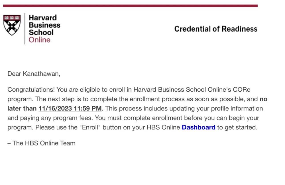ซึ่งโปรแกรมแรกที่จูนเรียน ต้องใช้เวลาประมาณครึ่งปีถึงจะจบและได้ผลการเรียน เพราะมีการสอบ Final ด้วยค่ะ อาจารย์ที่สอนจูนก็ระดับโลกมากๆ ค่าเทอมเฉพาะค่าวิชาเรียนอย่างเดียวในโปรแกรมแรกนี้ก็ร่วมแสน จูนก็ดำเนินการลงทะเบียนและชำระค่าเทอมเรียบร้อยครบทุกกระบวนการแล้ว รอเปิดเทอมค่ะ และเมื่อเราสอบ Final เสร็จและเรียนจบ ทางมหาวิทยาลัย Harvard จะออกหนังสือรับรองผลการเรียนและการจบให้เราค่ะ เรียกว่าใบ credential of readiness (โปรแกรมที่จูนเรียนนี้จะไม่ใช่ใบเซอร์) หลังจากนั้น จูนก็ดำเนินการเรียนต่อในสเต็ปต่อไปค่ะ ซึ่งโปรแกรมที่จูนเลือกเรียน คือ core program วิชาเรียนในโปรแกรมนี้ก็เหมือนเป็นการเรียน pre MBA แบบที่หลายๆคนเตรียมพร้อมจะเข้าเรียน MBA Harvard Business School อย่างเต็มตัวนั่นเองค่ะ ซึ่งก็ต้องไปเรียนที่มหาวิทยาลัย Harvard ที่อเมริกา 2 ปีกันเลย โปรแกรมนี้ตรงสายกับคนที่กำลังจะเข้าเรียน MBA ค่ะ ซึ่งโปรแกรมที่จูนเรียนจะมีวิชาหลักๆทาง MBA ของระดับผู้นำ ผู้บริหารอยู่ 3 วิชาค่ะคือ economic for manager ,business analytics, financial accounting ซึ่งโชคดีที่จูนเรียนจบ ป.ตรี คณะเศรษฐศาสตร์การค้าระหว่างประเทศมา เรียกว่าตรงสายนี้ของมหาวิทยาลัยเลยค่ะ จูนเลยได้ตัดสินใจเลือกเรียน Harvard Business School Online เพราะขณะนี้ จูนก็กำลังศึกษาระดับปริญญาโท การทูตและความสัมพันธ์ระหว่างประเทศอยู่ที่เมืองไทยด้วย แผนการเรียนที่จูนเลือกก็จะลงตัวกับจูนมากที่สุดในตอนนี้ ก่อนจะเรียนไปถึงสเต็ปต่อไปค่ะ