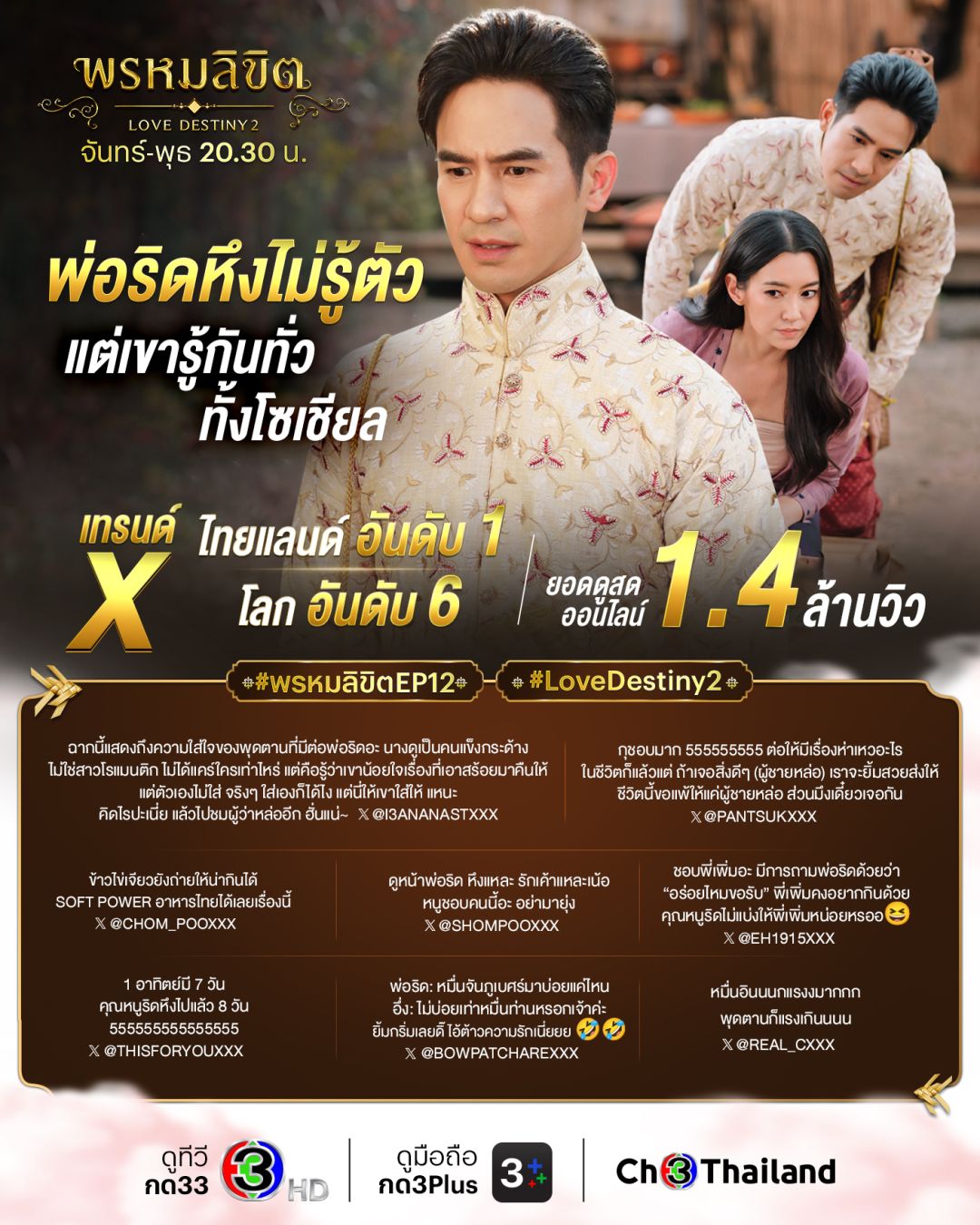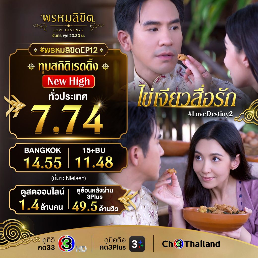 นาทีนี้ไม่มีใครไม่ดู ไม่มีใครไม่รู้จัก กับละครพีเรียดฟอร์มยักษ์ “พรหมลิขิต” ทางช่อง 3 ที่ทำสาวกออเจ้าละสายตาไม่ลง นับวันก็ยิ่งทุบสถิติกระแสแรงฟีเวอร์ ล่าสุดไม่อวยไม่ได้กับอีพี 12 ที่สามารถทุบเรตติ้งสะเทือนแรงทั้งแผ่นดินไปได้มากถึง 7.74ในส่วนของพื้นที่กรุงเทพฯก็ไม่น้อยหน้า พุ่งทะยานสูงสุดถึง 14.55กลุ่มผู้ชมอายุ 15 ปี ขึ้นไป หรือ กลุ่ม 15 BU+ (Bangkok and Urban) พุ่งไปถึง 11.48รวมทั้งยอดดูสดออนไลน์ตัวเลขชวนขนลุกถึง 1.4 ล้านคนและยอดดูย้อนหลังผ่าน 3Plus 49.5 ล้านวิว