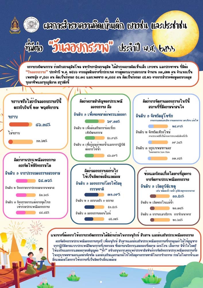 วันที่ 24 พฤศจิกายน 2566 นายเสริมศักดิ์ พงษ์พานิช รัฐมนตรีว่าการกระทรวงวัฒนธรรม เปิดเผยว่า กระทรวงวัฒนธรรม(วธ.) ร่วมกับสวนดุสิตโพล มหาวิทยาลัยสวนดุสิต ได้สำรวจความคิดเห็นเด็ก เยาวชน และประชาชน ที่มีต่อ “วันลอยกระทง” ประจำปี พ.ศ. 2566 จากกลุ่มตัวอย่างทั่วประเทศ 17,428 คน ครอบคลุมทุกอาชีพและทุกภูมิภาค โดยผลสรุปพบว่า เด็ก เยาวชน และประชาชนส่วนใหญ่ ร้อยละ 86.38 ทราบว่าวันลอยกระทงปีนี้ตรงกับวันที่ 27 พฤศจิกายน เมื่อสอบถามความเห็นการลอยกระทง เป็นการร่วมสืบสานประเพณีวัฒนธรรมให้คงอยู่คู่สังคมไทยหรือไม่ ผู้ตอบแบบสอบถาม ร้อยละ 92.33 เห็นด้วย และเห็นว่าประเพณีลอยกระทงมีความสำคัญอย่างไร 3 อันดับแรก คือ ร้อยละ 69.33 เพื่อขอขมาต่อพระแม่คงคา บูชาสิ่งศักดิ์สิทธิ์ ร้อยละ 50.98 เพื่อส่งเสริมการท่องเที่ยวเชิงวัฒนธรรม และร้อยละ 46.49 เพื่อรู้คุณค่าของน้ำ และการปฏิบัติต่อการใช้น้ำ เนื่องจากน้ำเป็นสิ่งสำคัญที่ใช้ในการดำรงชีวิตประจำวัน