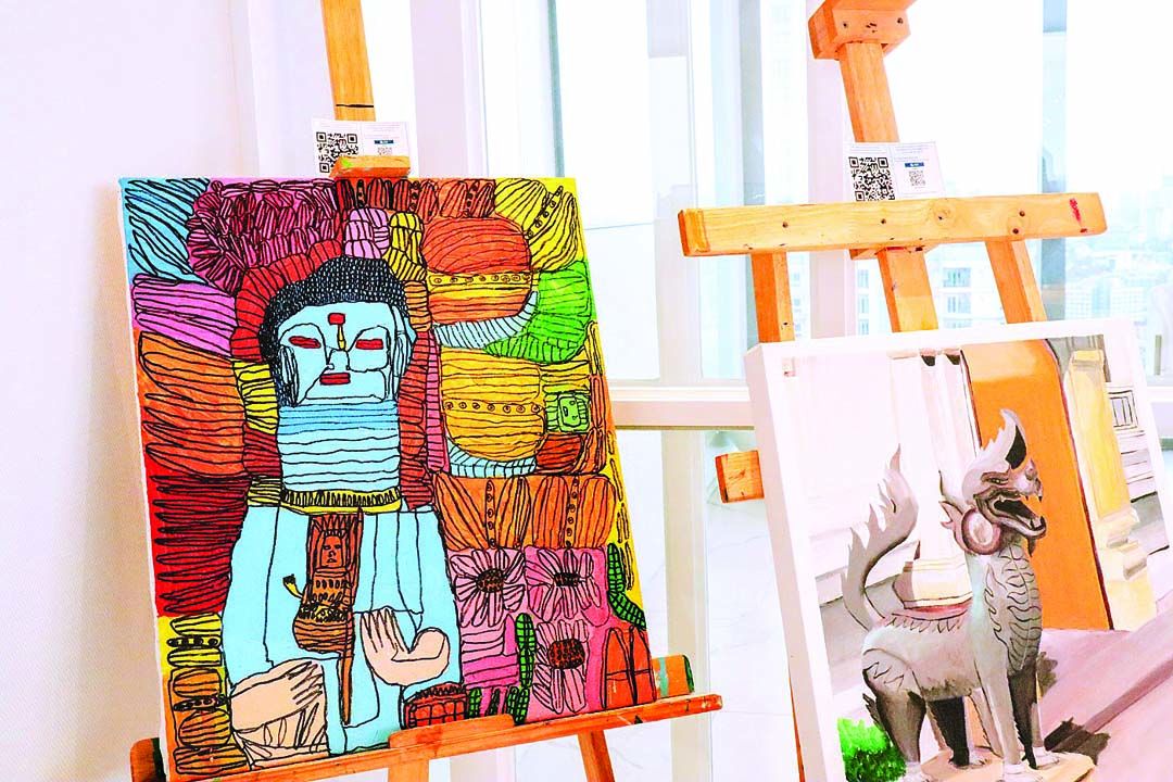 ผลงานศิลปะจากนอกจากฝีไม้ลายมือของแขกที่มาร่วมงานแล้ว ยังมีที่สร้างสรรค์โดยศิลปิน แต่ละชิ้นโดดเด่นด้วยภาพวาดพระพุทธรูปไปจนถึงองค์ประกอบของธรรมชาติ เช่น ดอกไม้ที่จัดแสดงบนแท่นบูชา และภาพสิงโตในรูปแบบไทยดั้งเดิม”