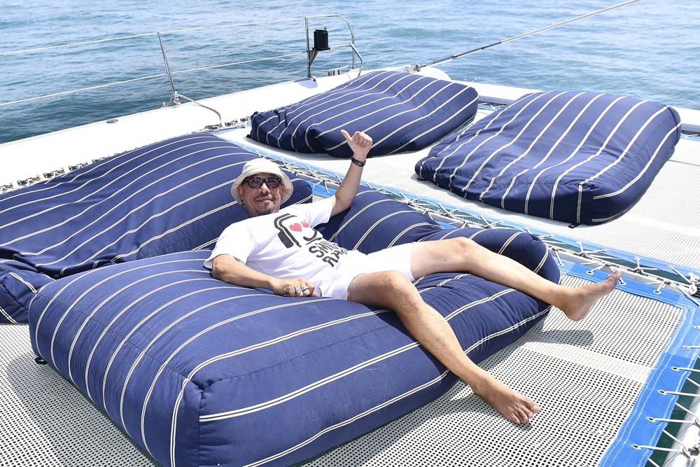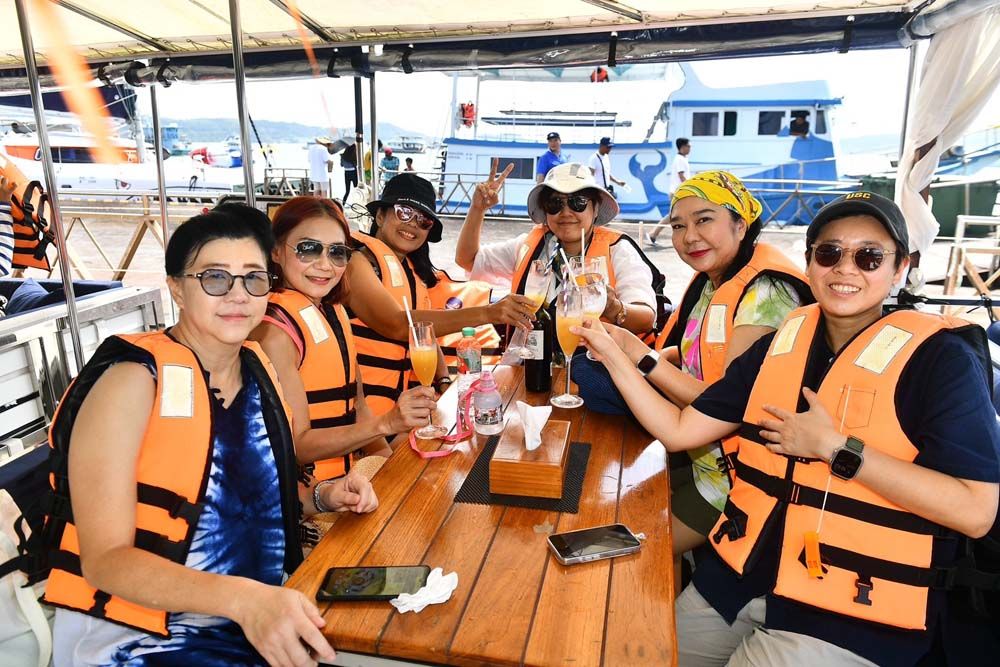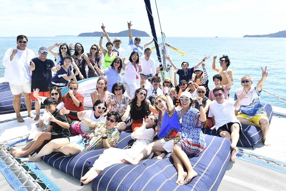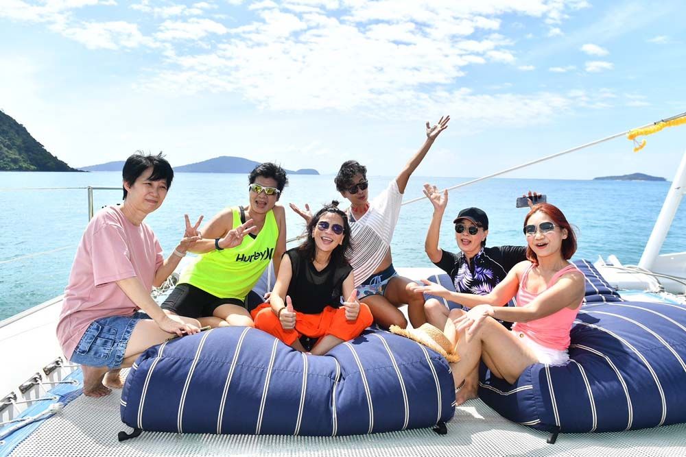 อาหารเช้าที่นี่เริ่ม 06.30 น. เป็นแบบ International เพราะลูกค้าส่วนใหญ่เป็นชาวต่างชาติ ก่อนนั่งรถตู้ชั่วโมงกว่าๆ ไปยังท่าเรืออ่าวฉลองเพื่อขึ้นเรือใบยอชต์คาตามารัน (Catamaran) ที่มีที่นั่งตาข่ายสุดชิคและท้าทายด้านหน้าถึงกระนั้นหลายคนชอบไปถ่ายรูปกันตลอด เราไปกัน 2 ลำโดยแบ่งผู้บริหาร ดีเจ และแฟนพันธุ์แท้ของ Smile Radioออกเป็น 2 กลุ่มใหญ่