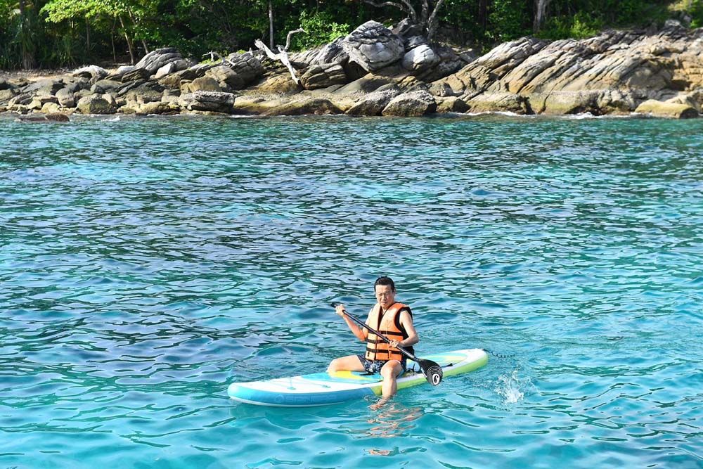 ถึงแม้ภาคใต้ยังไม่หมดพายุฝน ท้องฟ้าวันนี้ค่อนข้างสดใส เราใช้เวลาเดินทางไปยังเป้าหมายแรกของเราคือเกาะเฮเพื่อไปรับประทานอาหารเที่ยงและพักผ่อน หรือเล่นน้ำทะเลเราต้องเดินขึ้นท่าเทียบเรือเกาะเฮแบบทุ่นจิ๊กซอว์ที่ยวบยาบและแกว่งเมื่อเจอคลื่น เสน่ห์ของเกาะเฮ คือน้ำทะเลใส หาดทรายขาว ปะการังสวย ที่ชาวต่างชาติมา Snorkelling ดูฝูงปลาเล็กปลาน้อย Sunbathe บนผ้าชิลๆ บนผืนทราย หรือพายคายักหรือเรือกล้วย ที่นี่เราเห็นชาวต่างชาติสนุกกับการเล่นพาราเซลลิ่งเพื่อชมความงามของเกาะจากท้องฟ้า