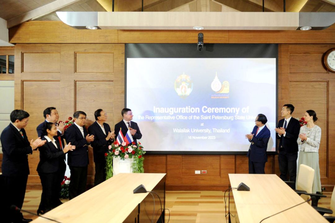 ศาสตราจารย์ ดร.สมบัติ ธำรงธัญวงศ์ รักษาการแทนอธิการบดีมหาวิทยาลัยวลัยลักษณ์และ ดร.เซอร์เกย์ อันดรูชิน (Dr. Sergey Andryushin) รองอธิการบดีมหาวิทยาลัยแห่งรัฐเซนต์ปีเตอร์สเบิร์ก ลงนามร่วมมือจัดตั้งสำนักงานตัวแทนมหาวิทยาลัยแห่งรัฐเซนต์ปีเตอร์สเบิร์ก สหพันธรัฐรัสเซีย ที่ มหาวิทยาลัยวลัยลักษณ์ พร้อมเปิดสำนักงานดังกล่าว เพื่อพัฒนาและเสริมสร้างความร่วมมือทางด้านวัฒนธรรม การศึกษา ภาษาระหว่างสองสถาบันร่วมกัน โดย นายเยฟกินี โทมิคิน (Evgeny Tomikhin) เอกอัครราชทูตรัสเซียประจำประเทศไทย ได้ส่งสารและส่งผู้แทนมาแสดงความยินดีในพิธีเปิดสำนักงาน ณ ห้องประชุมช่อประดู่อาคารจุฬาภรณเวชวัฒน์ รพ.ศูนย์การแพทย์ ม.วลัยลักษณ์ เมื่อวันก่อน