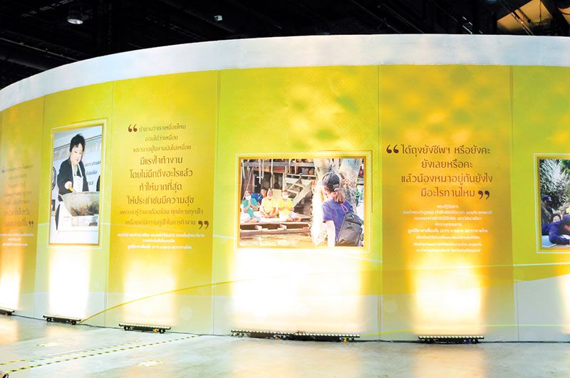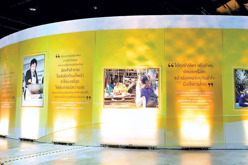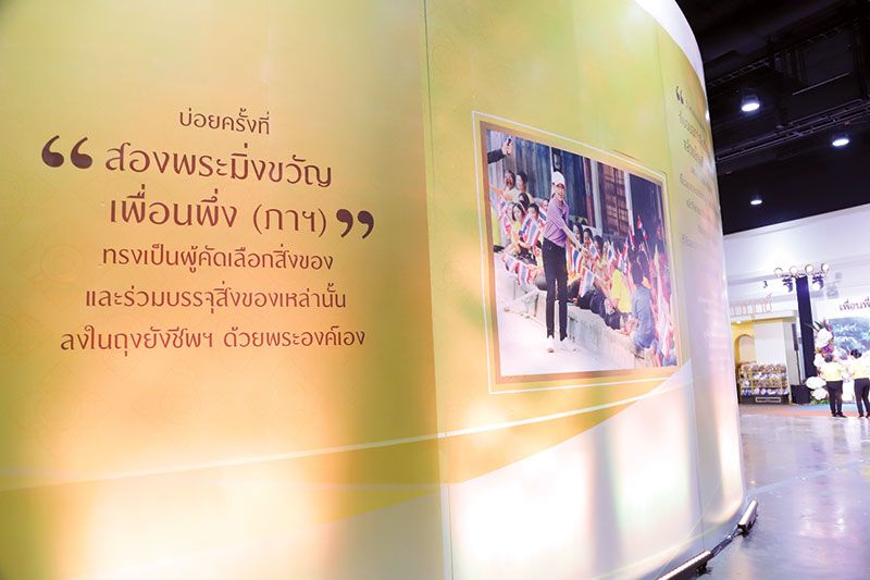 ภายในงานประกอบด้วยนิทรรศการที่สื่อถึงน้ำพระทัยที่ทั้งสองพระองค์ทรงห่วงใยและช่วยเหลือประชาชนอย่างต่อเนื่องตลอดมา โดยมีพันธกิจหลัก 3 ด้าน คือ เฝ้าระวัง บรรเทาทุกข์ และฟื้นฟู จัดแสดงในห้องแกลเลอรี่ทรงหยดน้ำที่บอกเล่าเรื่องราวการช่วยเหลือผู้ประสบอุทกภัย ในรูปแบบ Immersive Exhibition ด้วยเทคนิคการใช้ภาพและเสียง ผู้ที่เข้าไปชมจะรู้สึกเหมือนอยู่ในเหตุการณ์จริง โซน “เฝ้าระวัง…เตือนภัยก่อนเกิดอุทกภัย” สาธิตการทำงานของสถานีโทรมาตรอัตโนมัติเวลาเมื่อเกิดเหตุจริง โซน “บรรเทาทุกข์…ระหว่างเกิดอุทกภัย” นำเสนอกิจกรรม “จัดถุงยังชีพฯ สัญลักษณ์แห่งขวัญและกำลังใจในรูปแบบ Interactive” เชิญชวนร่วมแบ่งปัน เพื่อนำไปช่วยเหลือผู้ประสบอุทกภัย พร้อมถ่ายภาพเป็นที่ระลึก และรับของที่ระลึกแทนคำขอบคุณจากมูลนิธิฯ เรียกได้ว่า “สุขที่ได้แบ่งปัน” กิจกรรม“รถเพื่อนพึ่ง (ภาฯ) ช่วยด้วยใจ คนไทยไม่ทิ้งกัน” การจำลองรถประกอบอาหาร เห็นถึงพระเมตตาที่ทรงมีต่อผู้ประสบอุทกภัย ด้วยอาหารสูตรประทานพระเจ้าวรวงศ์เธอ พระองค์เจ้าโสมสวลี กรมหมื่นสุทธนารีนาถ โซน “ฟื้นฟู…หลังเกิดอุทกภัย”พบกับมุมถ่ายภาพฉากจำลองอุทกภัย ที่ให้ความรู้สึกเหมือนอยู่ในสถานการณ์จริง