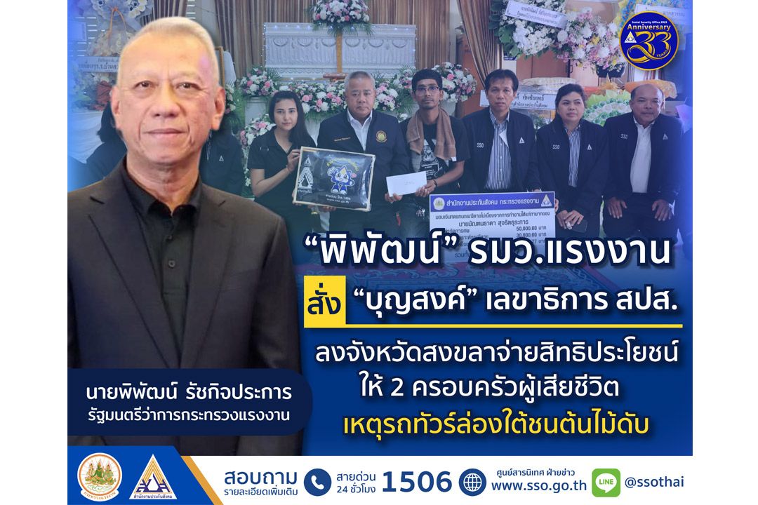 เมื่อวันที่ 11 ธันวาคม 2566 นายพิพัฒน์ รัชกิจประการ รัฐมนตรีว่าการกระทรวงแรงงาน มอบหมายให้นายบุญสงค์ ทัพชัยยุทธ์ เลขาธิการสำนักงานประกันสังคม พร้อมด้วย นายปฐพี จิระวรรณ ประกันสังคมจังหวัดสงขลา นางเยาวดี เพ็ชรเกลี้ยง ประกันสังคมจังหวัดนครศรีธรรมราช นางชุติมา เหมทานนท์ ประกันสังคมจังหวัดพัทลุง และผู้บริหาร เจ้าหน้าที่ ร่วมลงพื้นที่ในจังหวัดสงขลา รุดมอบเงินสิทธิประโยชน์ให้ 2 ครอบครัวผู้ประกันตนมาตรา 33 ของนายมัณฑนธาดา สุจิตธุระการ และครอบครัวนางสาวอัญชลี แฝงจันดา ที่จังหวัดสงขลา ที่เสียชีวิตจากเหตุการณ์รถโดยสารปรับอากาศเสียหลักตกไหล่ทางชนต้นไม้ที่จังหวัดประจวบคีรีขันธ์