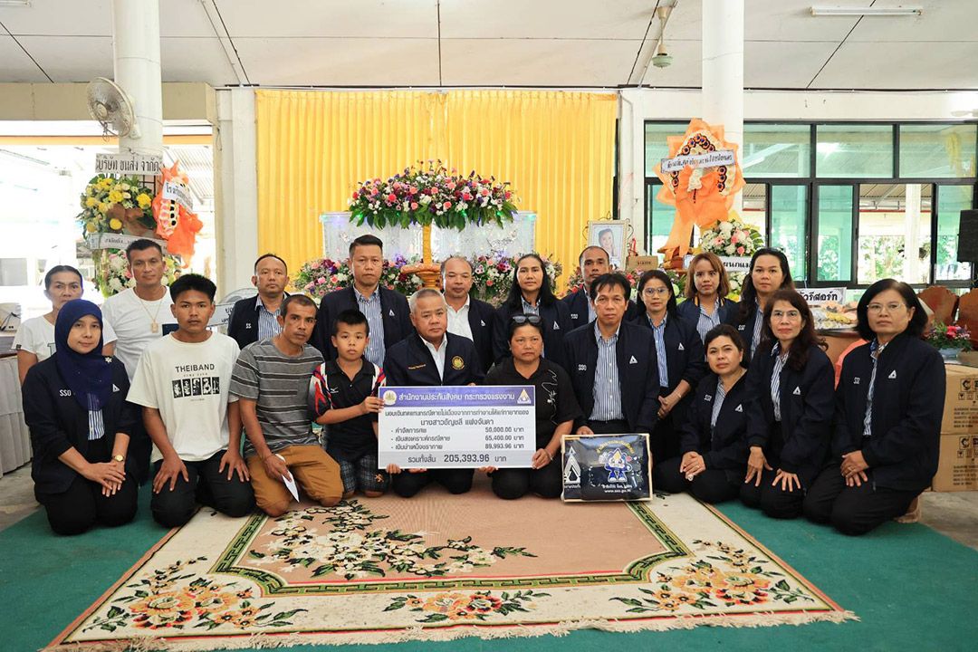 จากนั้นนายบุญสงค์ ทัพชัยยุทธ์ เลขาธิการสำนักงานประกันสังคม และคณะผู้บริหาร ได้เดินทางไปยังวัดธรรมโฆษณ์ ตำบลสทิงหม้อ อำเภอสิงหนคร จังหวัดสงขลา เพื่อให้กำลังใจและมอบเงินสิทธิประโยชน์กรณีตายให้กับครอบครัวนางสาวอัญชลี แฝงจันดา ผู้ประกันตนมาตรา 33 เป็นเงินค่าทำศพ 50,000 บาท เงินสงเคราะห์กรณีตาย 65,400 บาท และเงินบำเหน็จชราภาพ 89,993.96 บาท รวมเป็นเงินทั้งสิ้น 205,393.96 บาท