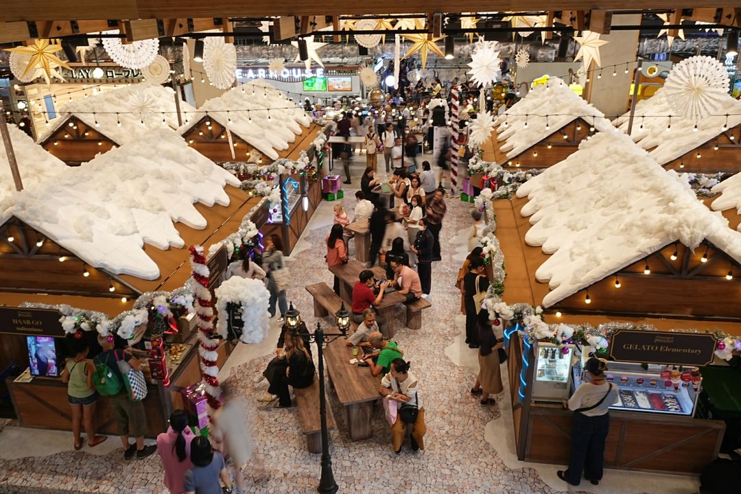 ช้อป ชิม ชิล เสมือนเดินรับลมหนาวในต่างประเทศ กับการเนรมิตพื้นที่บริเวณบริเวณสเฟียร์ มาร์เก็ตSphere Marketชั้น G EMSPHERE ให้กลายเป็นคริสต์มาส มาร์เก็ตขนาดย่อมที่ถูกย้อมไปด้วยหิมะสีขาวท่ามกลางบรรยากาศแห่งการเฉลิมฉลอง ทั้งการออกบูธจากร้านอาหาร ขนม และเครื่องดื่มมากมายประดับประดาบริเวณโดยรอบเหมือนได้อยู่ในช่วงเทศกาลให้ถ่ายรูปเช็คอินกันแบบเพลิน ๆ นอกจากนี้ยังมีบริการโต๊ะและเก้าอี้ไว้ให้นั่งชิลแวะพักจิบเครื่องดื่มแก้กระหาย และชิมอาหารสุดอร่อย