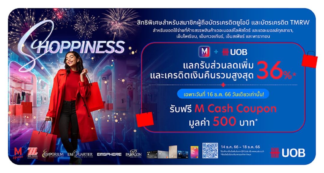 เดอะมอลล์ กรุ๊ป ร่วมกับธนาคารยูโอบี จัดแคมเปญ “UOB | CitiShoppiness” ระหว่างวันที่ 14 – 18ธันวาคม 2566มอบโปรโมชั่นพิเศษสุดเอ็กซ์คลูซีฟ ตลอด 5 วันเต็มต้อนรับเทศกาลแห่งการเฉลิมฉลอง ที่ห้างสรรพสินค้าเดอะมอลล์ และเดอะมอลล์ไลฟ์สโตร์ ทุกสาขา, เอ็มโพเรียม, เอ็มควอเทียร์, เอ็มสเฟียร์ และพารากอน มอบความพิเศษสำหรับสมาชิกบัตร M Card และลูกค้าบัตรเครดิตUOB และบัตรเครดิตCiti แลกรับส่วนลดเพิ่มหรือเครดิตเงินคืนรวมสูงสุด36%และเฉพาะวันที่ 16 ธ.ค. 66 วันเดียวเท่านั้น ตั้งแต่เวลา 11.00 น. เป็นต้นไปรับฟรี!M CASH COUPONมูลค่า 500 บาทที่เดอะมอลล์ไลฟ์สโตร์ ทุกสาขา, เดอะมอลล์ทุกสาขา (ยกเว้นรามคำแหง),เอ็มโพเรียม,และ พารากอน ดีพาร์ทเม้นท์สโตร์