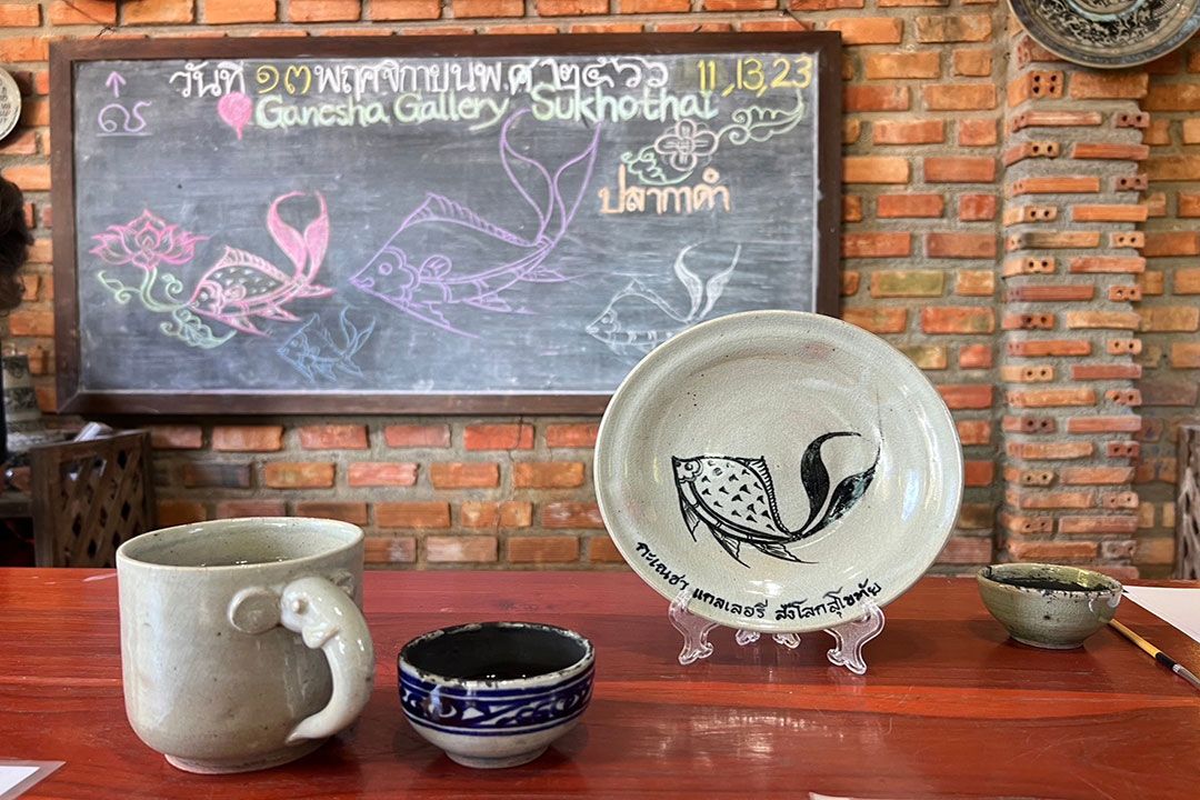 ชุมชนเมืองเก่าสุโขทัย จ.สุโขทัย อัตลักษณ์ กิจกรรม “การเขียนลายสังคโลก” ลวดลายแบบดั้งเดิมในสมัยสุโขทัย เช่น รูปปลา กงจักร ดอกไม้ เป็นต้น ที่สร้างสรรค์ลายเส้น สี และการลงมือวาดได้ด้วยตนเอง
