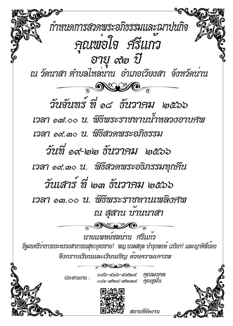 ทั้งนี้ จะมีพิธีสวดอภิธรรม เวลา 19.30 น ณ วัดบ้านนาสา อ เวียงสา และพระราชทานเพลิงศพ ในวันที่ 23 ธ.ค.2566 ณ สุสานบ้านนาสา อ. เวียงสา จ.น่าน