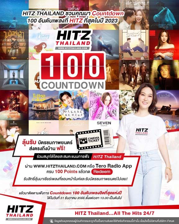 “ปกติโบรับหน้าที่รายงานเพลงฮิตของแต่ละสัปดาห์อยู่แล้วค่ะ เลยพอจะเดาได้ว่าเพลงไหนบ้าง ที่จะติดอยู่ใน HITZ 100 Countdown ประจำปีนี้ รับรองว่ามีแต่เพลงเพราะๆ ที่เราร้องตามกันได้แน่นอน อยากให้มาติดตามฟังและลุ้นไปพร้อมๆ กัน ในวันที่ 31 ธันวาคม ตั้งแต่เวลา 13.00 น. เป็นต้นไปนะคะ นอกจากนี้ ทุกคนยังสามารถลงทะเบียนร่วมสนุกเพื่อมาทายอันดับเพลงหน้าไมค์กับดีเจ และลุ้นรางวัลบัตรชมภาพยนตร์ได้ง่ายๆ เพียงแค่สะสมคะแนนการฟัง HITZ Thailand ผ่านทาง http://www.HITZThailand.com หรือ Tero Radio App แล้วใช้ 100 คะแนนกดรีดีมเพื่อลงทะเบียนได้เลยค่ะ ร่วมสนุกกันได้ถึงวันที่ 29 ธันวาคมนี้ เท่านั้นนะคะ” ติดตามฟัง 100 อันดับเพลงที่ฮิตที่สุดประจำปี 2566 ได้ตั้งแต่เวลา 13.00 น ของวันที่ 31 ธันวาคม 2566 ทาง HITZ Thailand หรือทาง Tero Radio App ดูรายละเอียดเพิ่มเติมได้ที่ http://www.HITZThailand.com