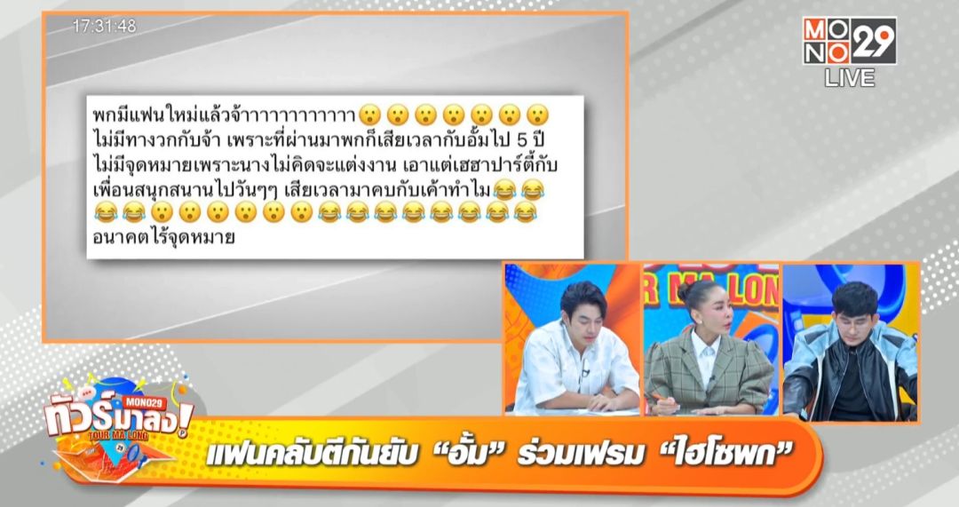 อัปเดตข่าวแซ่บเม้าท์ข่าวร้อนไม่ต้องหลับต้องนอนกับรายการ“ทัวร์มาลง” ทุกวันจันทร์ถึงวันศุกร์ เวลา 17.05 น. ทางช่อง MONO29ในวันอังคารที่ 19ธันวาคมนี้โดยสามพิธีกรปากแซ่บพชร์-อานนท์ ,เป็กกี้-ศรีธัญญา และอาร์ต-พศุตม์ บานแย้มประเดิมเรื่องเม้าท์วงการบันเทิงล่าสุด หลังผ่านพ้นไปแล้วกับบรรยากาศหวานชื่น ของงานวิวาห์ระหว่างดาราสาว เมย์-พิชญ์นาฏสาขากรและ ไฮโซบิ๊ก-อัครวัชรคงสิริกาญจน์ที่ชาวเน็ตไปให้ความสนใจกับโมเม้นต์ ของนางเอกสาวแถวหน้าของไทย อั้ม-พัชราภาไชยเชื้อกลายเป็นประเด็นดราม่าจนชาวเน็ตเสียงแตกเป็น 2 ฝ่ายพิธีกร อาร์ต เล่าข่าวว่าผู้จัดการชื่อดัง เอ-ศุภชัยศรีวิจิตรโพสต์คลิปวิดีโอในไอจีที่มีสาว อั้ม และอดีตแฟนหนุ่มอย่าง ไฮโซพก-ประธานวงศ์พรประภาแล้ว พี่เอ ดันไปใส่เพลง ซ่อนกลิ่น เป็นเพลงที่มีความหมายว่าแอบคิดถึงคนเก่าแฟนคลับบางกลุ่มรอลุ้นจับตาความสัมพันธ์คู่นี้ว่าจะมีรีเทิร์น พิธีกร เป็กกี้ ก็โต้กลับว่าไม่ได้มีคอมเม้นต์เชียร์อย่างเดียว แต่มีแฟนคลับอีกฝั่งที่สวนกระแส“พกมีแฟนใหม่แล้วจ้า ไม่มีทางวกกลับมา เพราะเสียเวลาไปตั้ง 5 ปีไม่มีจุดหมายเพราะนางไม่คิดจะแต่งงาน”บางเสียงก็บอกว่า ไฮโซพก มีแฟนใหม่เป็นหมอเหมาะสมกันมาก ๆ ไม่ช้าคงแต่งงานแน่เอ้า!! แบบนี้ชาวเน็ตต้องจับมือกันไว้ ให้กำลังใจทั้งคู่ดีกว่าเนอะ