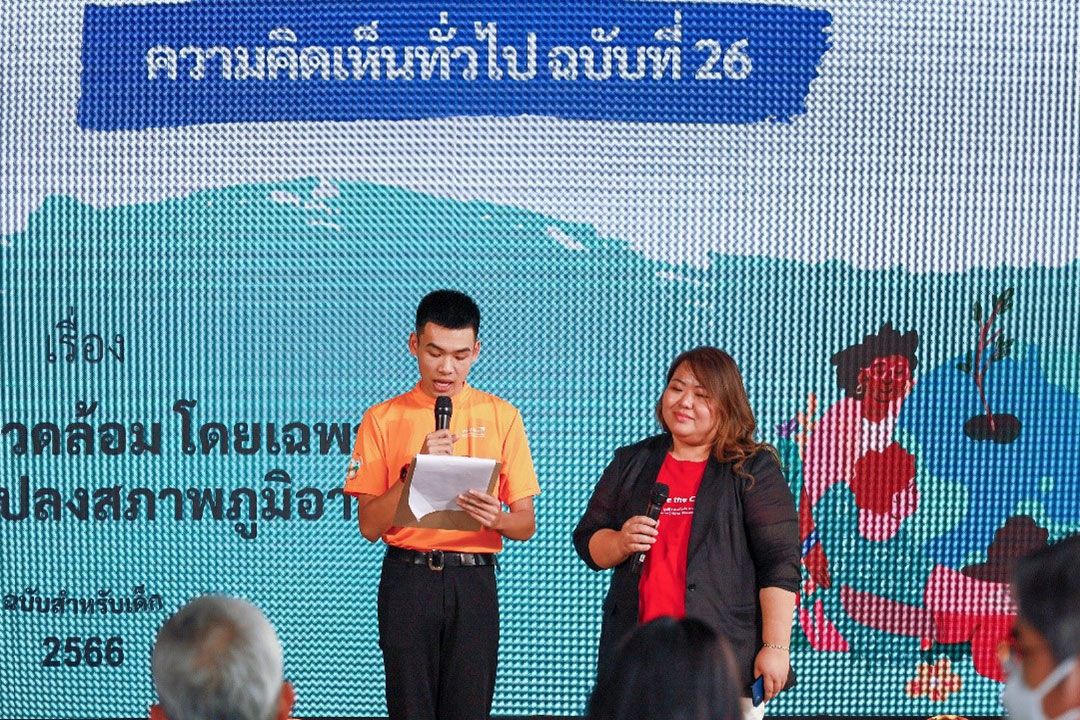 “เด็กมีสิทธิในการเข้าถึงสภาพแวดล้อมที่สะอาด ถูกสุขอนามัย และยั่งยืน รัฐต้องรับผิดชอบ ไม่เพียงแต่การปกป้องสิทธิเด็กจากอันตรายที่เกิดขึ้นในทันที แต่ยังรวมถึงการละเมิดสิทธิเด็กที่มีความเสี่ยงต่อเด็กและเยาวชนในอนาคตด้วย ซึ่งอาจเกิดจากการกระทำหรือการละเลยของทุกภาคส่วน ผมขอให้ทุกคนได้ผลักดันสิทธิเด็กและปัญหาสิ่งแวดล้อมให้เป็นภาระสำคัญเร่งด่วนที่สุด รวมถึงการให้เด็กและเยาชนมีบทบาทในการสร้างความเปลี่ยนแปลง และการเสนอแนะในเชิงนโบบาย เพื่อให้เด็กทุก ๆ คนได้เติบโตในโลกที่สวยงาม” ส่วนหนึ่งของการกล่าวรายงานโดย นายศักดิ์นฤน ขามธาตุ อดีตเด็กในความอุปการะ มูลนิธิศุภนิมิตฯ ในฐานะตัวแทนเยาวชน