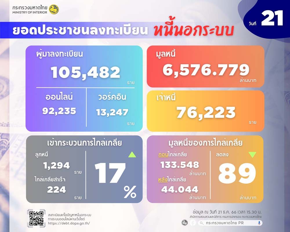 ปลัดมหาดไทย เผยยอดลงทะเบียนหนี้นอกระบบครบ 21 วัน เจ้าหนี้-ลูกหนี้ไกล่เกลี่ยสำเร็จแล้ว 224 ราย มูลหนี้ลดลงร่วม 90 ล้านบาท พี่น้องประชาชนยังคงลงทะเบียนอย่างต่อเนื่อง ลงทะเบียนแล้ว 105,482 ราย มูลหนี้ 6,576 ล้านบาท เน้นย้ำการทำงานคู่ขนาน ทั้งการเชิญชวนประชาชนลงทะเบียนควบคู่กับการประสานบูรณาการการปฏิบัติกับหน่วยงานที่เกี่ยวข้องในระดับพื้นที่ เพื่อเข้าสู่ขั้นตอนการเจรจาไกล่เกลี่ยหนี้