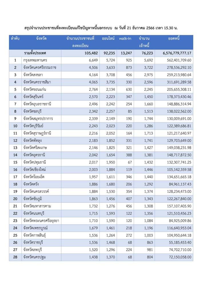 21 ธ.ค. 66 นายสุทธิพงษ์ จุลเจริญ ปลัดกระทรวงมหาดไทย เปิดเผยถึงการลงทะเบียนแก้ไขปัญหาหนี้นอกระบบ ซึ่งเป็นวันที่ 21 นับตั้งแต่เปิดลงทะเบียน โดยจากข้อมูลของสำนักการสอบสวนและนิติการ กรมการปกครอง เมื่อเวลา 15.30 น. มีมูลหนี้รวม 6,576.779 ล้านบาท ประชาชนลงทะเบียนแล้ว 105,482 ราย โดยเป็นการลงทะเบียนผ่านระบบออนไลน์ 92,235 ราย และการลงทะเบียน ณ ศูนย์อำนวยการแก้ไขหนี้นอกระบบ 13,247 ราย รวมจำนวนเจ้าหนี้ 76,223 ราย มีพื้นที่/จังหวัดที่มีผู้ลงทะเบียนมากที่สุด 5 ลำดับแรก 1. กรุงเทพมหานคร ยังคงมากที่สุด มีผู้ลงทะเบียน 6,649 ราย เจ้าหนี้ 5,692 ราย มูลหนี้ 562.401 ล้านบาท 2. จังหวัดนครศรีธรรมราช มีผู้ลงทะเบียน 4,506 ราย เจ้าหนี้ 3,722 ราย มูลหนี้ 278.536 ล้านบาท 3. จังหวัดสงขลา มีผู้ลงทะเบียน 4,164 ราย เจ้าหนี้ 2,975 ราย มูลหนี้ 259.213 ล้านบาท 4. จังหวัดนครราชสีมา มีผู้ลงทะเบียน 4,065 ราย เจ้าหนี้ 2,596 ราย มูลหนี้ 311.691 ล้านบาท 5. จังหวัดขอนแก่น มีผู้ลงทะเบียน 2,764 ราย เจ้าหนี้ 2,245 ราย มูลหนี้ 205.655 ล้านบาท ขณะที่จังหวัดที่มีผู้ลงทะเบียนน้อยที่สุด 5 ลำดับแรก ได้แก่ 1. จังหวัดแม่ฮ่องสอน มีผู้ลงทะเบียน 144 ราย เจ้าหนี้ 113 ราย มูลหนี้ 6.576 ล้านบาท 2. จังหวัดระนอง มีผู้ลงทะเบียน 221 ราย เจ้าหนี้ 138 ราย มูลหนี้ 15.658 ล้านบาท 3. จังหวัดสมุทรสงคราม มีผู้ลงทะเบียน 281 ราย เจ้าหนี้ 201 ราย มูลหนี้ 9.219 ล้านบาท 4. จังหวัดตราด มีผู้ลงทะเบียน 350 ราย เจ้าหนี้ 226 ราย มูลหนี้ 12.400 ล้านบาท และ 5. จังหวัดสิงห์บุรี มีผู้ลงทะเบียน 382 ราย เจ้าหนี้ 248 ราย มูลหนี้ 14.437 ล้านบาท